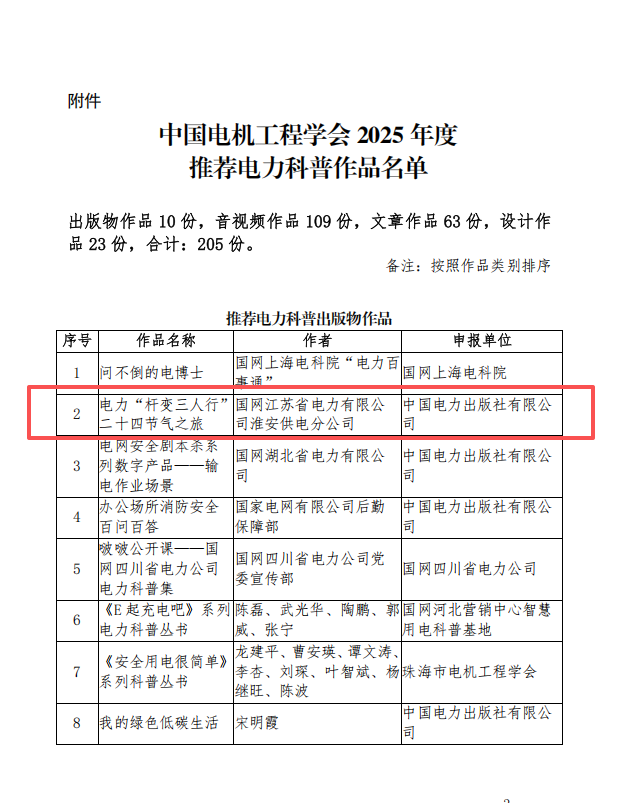 9月21日,中国电机工程学会公布了2025年度电力科普作品推荐名单,共有10件电力科普出版物作品获得推荐,由公司员工原创出版的绘本《电力“杆变三人行”二十四节气之旅》作为省内唯一入选推荐电力科普出版物作品。 为弘扬科学精神、普及电力科学知识,促进全民科学素质提升,中国电机工程学会组织开展了2025年度电力科普作品征集推荐工作,共分为电力科普出版物作品、电力科普音视频作品、电力科普音视频作品、电力科普设计作品四大类。活动得到了各单位的积极响应,共收到140家单位申报的517件作品,经组织专家遴选,总计205件电力科普作品获得推荐。 《电力“杆变三人行”二十四节气之旅》绘本以中国传统二十四节气为主线,将二十四节气进行场景化创作表达,同时巧妙融入电力设施保护、电力设施科普及安全用电常识等内容。今年2月由中国电力出版社出版发行,目前已发行超1万本,广泛用于用电安全进校园等场景。(审核:罗佳宝 作者:程曦)