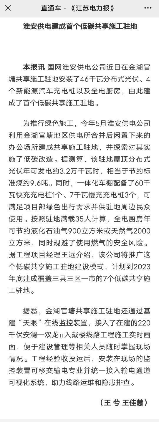 江苏电力报:淮安供电建成首个低碳共享施工驻地