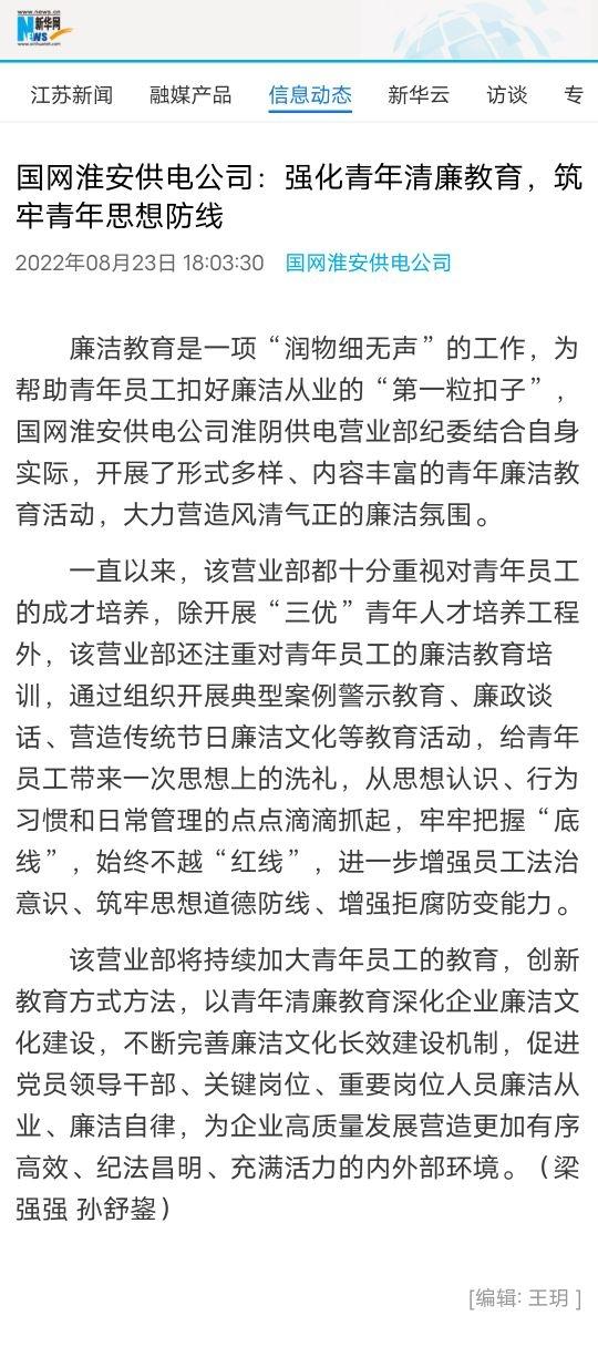 新华网:国网淮安供电公司:强化青年清廉教育,筑牢青年思想防线