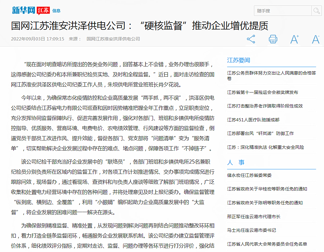 “现在面对明查暗访所提出的各类业务问题,回答基本上不会错,业务办理也很顺手,这得感谢公司纪委办和本所兼职纪检员实地、及时和全程监督。”近日,面对走访检查的国网江苏淮安洪泽区供电公司纪委工作人员,朱坝供电所营业班班长肖夕花说。 今年以来,为确保常态化疫情防控和企业高质量发展“两手抓,两不误”,洪泽区供电公司纪委结合江苏省电力有限公司巡查和因时因势精准把握全年工作重点,立足职责定位,充分发挥协同监督保障执行、促进完善发展作用,强化对各部门、班组和乡镇供电所疫情防控指导、优质服务、营商环境、电费电价、农电绩效管理、行风建设等方面的监督检查,倒逼党员干部员工改进作风、提升效能,督促各部门、党支部将“问题清单”变为“服务清单”,切实帮助解决企业发展过程中存在的难点、堵点问题,保障各项工作“不掉链子”。 该公司纪检干部充当好企业发展中的“联络员”,各部门班组和乡镇供电所25名兼职纪检员分别负责所在区域内的监督工作,对各项工作计划推进情况、交办事项完成情况进行跟踪问效,现场督办,通过看现场、查资料和与负责人座谈等细致了解部门班组情况,广泛收集和处置电力经营环境中存在的各种问题,并将处理意见及时上报纪委办。确保监督管理“纵到底、横到边、全覆盖”,利用“小眼睛”编织起助力企业高质量发展中的“大监督”,将企业发展的困难问题一一解决在源头。 为确保做到精准监督、精准处置,从发现问题到解决问题再到结合问题推动整改环环相扣,着力打造全链条监督闭环,畅通服务企业发展联系机制。该公司纪委办建立监督管理评价体系,细化绩效评分指标,定期对走访、监督、问题办理等各环节进行打分评价,强化结果运用,奖惩并举,不断释放全面从严、一严到底的强烈信号,确保企业管理各项任务落地、责任落实。 该公司纪委办牵头制定兼职纪检员服务管理细则,对纪委委员和兼职纪检员走访企业周期次数、政策宣传、问题反馈、落实解决等方面提出明确要求。同时,5名纪委委员对责任区监督工作实行“一周一提醒、两周一通报、一月一督查”,及时跟踪掌握各部门班组工作成效和作风评价情况。一旦发现对客户或员工提出的合理诉求故意为难、推诿扯皮、不作为等行为和在服务企业高质量发展中权力寻租、利益输送、吃拿卡要、徇私舞弊等问题,一律严肃追责问责、通报曝光,最大限度提高企业运行效率。 在此基础上,该公司从8月20日至9月23日利用一个多月的时间开展“以案促改千所行”警示教育活动,纪检干部全部下沉供电所讲政策、讲案例、讲风险,收集整理农电领域存在的突出问题、农电员工的诉求期盼等,分析研判基层一线心声,及时化解突出矛盾,教育和引导农电领域干部员工立足本职岗位遵规守纪、干事创业,持续提升农电领域治理能力与合规水平。(良军 贵祥 陈斌)