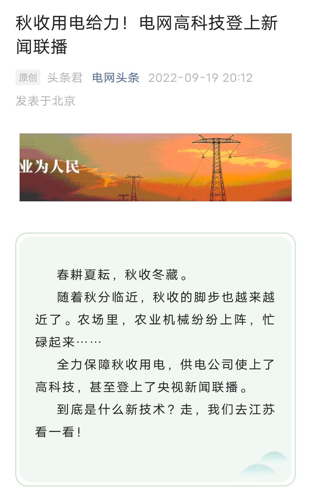 电网头条微信公众号:秋收用电给力!电网高科技登上新闻联播