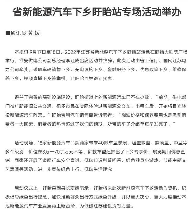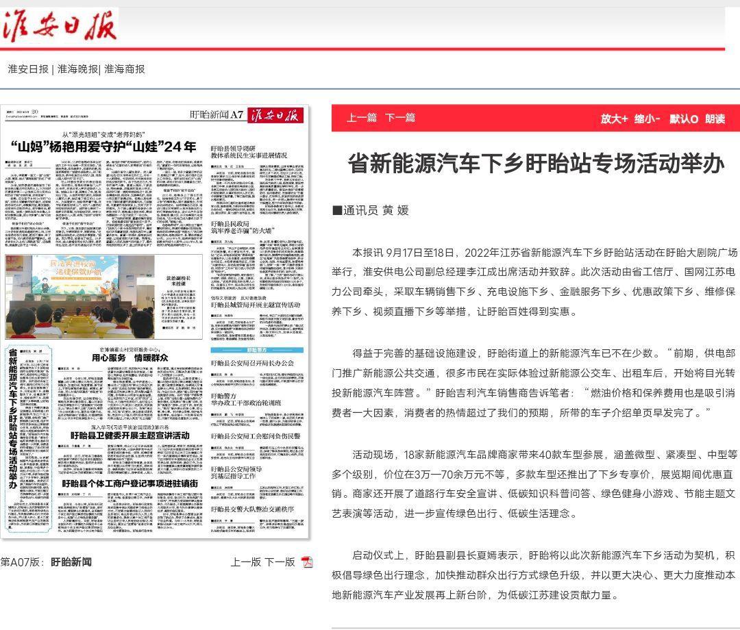 淮安日报:省新能源汽车下乡盱眙站专场活动举办