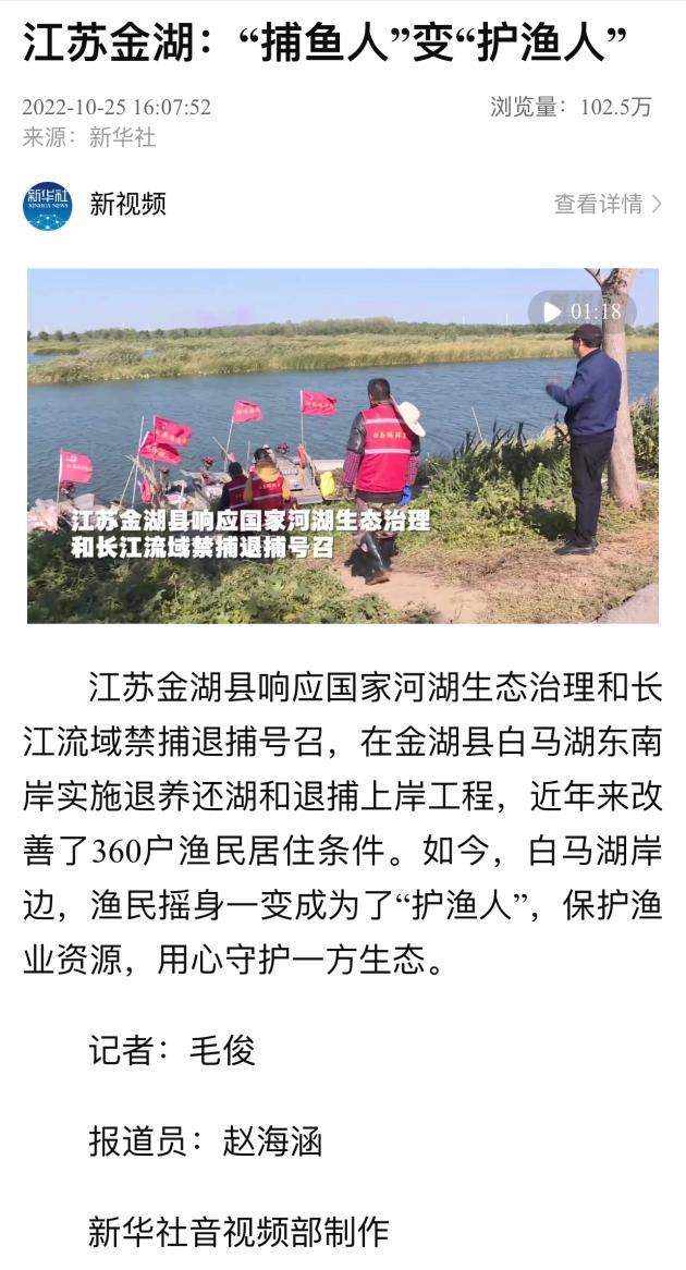 新华社:江苏金湖:“捕鱼人”变“护渔人”