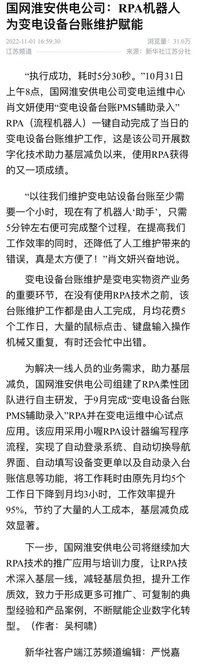 新华社:国网淮安供电公司:RPA机器人为变电设备台账维护赋能