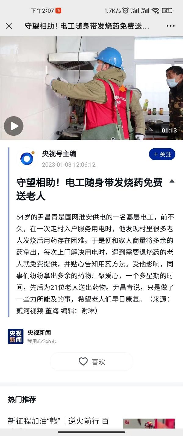 央视新闻客户端:守望相助!电工随身携带发烧药免费送老人