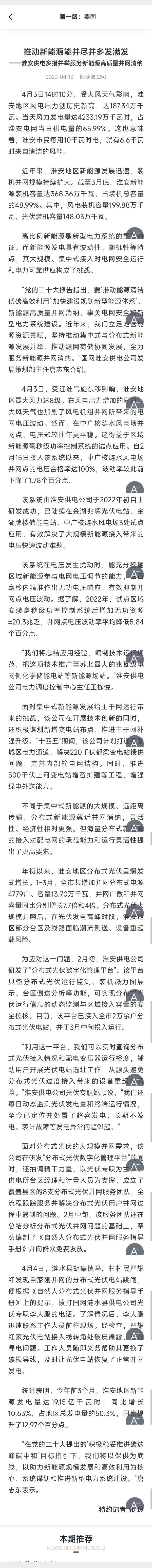 江苏电力报头版头条:推动新能源应并尽并多发满发——淮安供电多措并举服务新能源高质量并网消纳