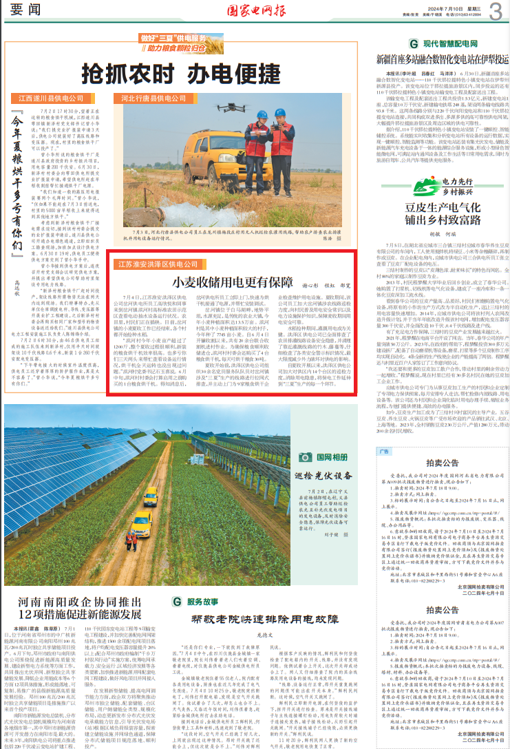 7月4日,江苏淮安洪泽区供电公司岔河供电所员工高欣悦和同事来到岔河镇滨河村高标准农田示范区查看电动抽水设备运行状况。农田里,村民们正在插秧。目前,岔河镇的小麦夏收工作已经结束,各个村都开始抢种水稻。 “滨河村今年小麦亩产超过了1200斤,整个夏收过程很顺利,新装的粮食烘干机效率很高。也多亏你们三天两头来帮忙查看设备运行情况,烘干机全天运转也没出现过问题。”滨河村党委书记石玉喜说。6月中旬,滨河村村委会打算启用之前购买的1台粮食烘干机。得知消息后,岔河供电所员工立即上门,快速为烘干机接通了电源,并帮忙安装调试。 岔河镇位于白马湖畔,地势平坦,水源充足,是传统的农业大镇,今年小麦种植面积达13.5万亩。滨河村是其中小麦种植面积较大的村子,今年种了7745亩小麦。自6月4日开镰收割以来,共有20余台联合收割机进村作业。为确保粮食顺利收储进仓,滨河村村委会还购买了4台粮食烘干机,每天可烘干粮食30吨。 夏收开始前,洪泽区供电公司组织30余名党员服务队队员对岔河镇涉及“三夏”生产的线路进行拉网式排查,并主动上门为9家粮食烘干企业检查维护用电设施。夏收期间,该公司员工加大岔河镇涉农线路巡检力度,向村民普及用电安全常识以及电力设施保护知识,保障麦收期间用电安全可靠。 水稻抢种期间,灌溉用电成为关键。洪泽区供电公司已全面排查了农田排灌线路设备安全隐患,并清理了靠近灌溉线路的竹木、藤蔓等,仔细检查了各类安全警示标识情况,最大限度减少外力破坏对供电的影响。 自夏收开展以来,洪泽区供电公司加大对供区内14个台区的巡检力度,消除用电隐患,将保电工作延伸到“三夏”生产的每一个环节。