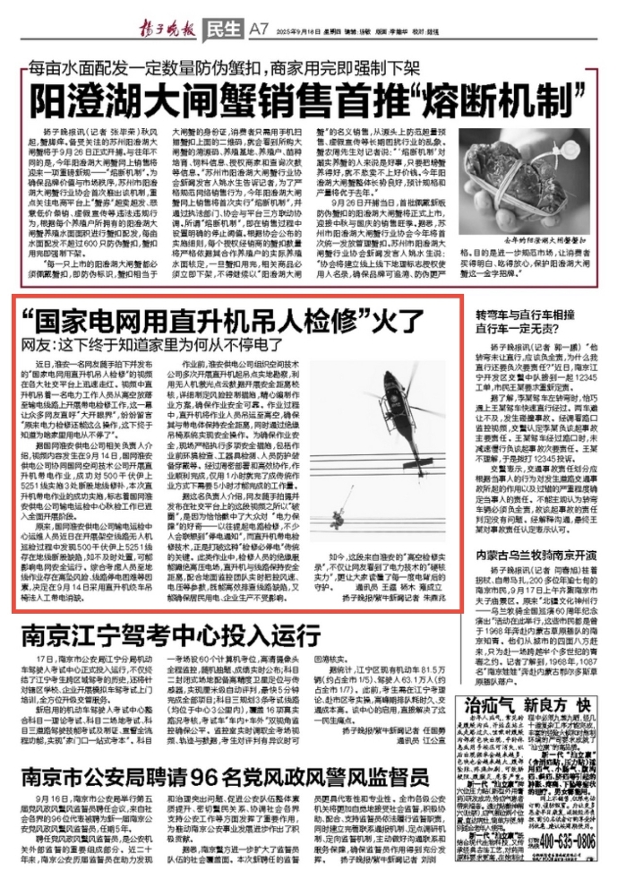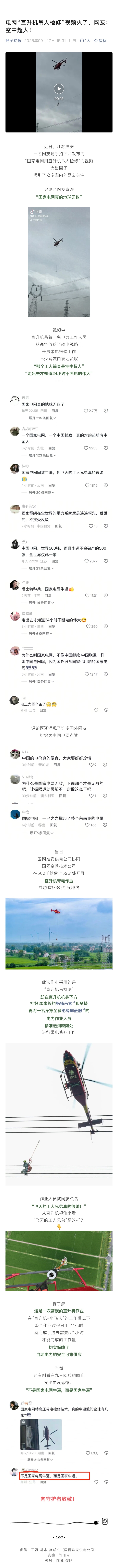 扬子晚报及微信公众号:电网“直升机吊人检修”视频火了,网友:空中超人!