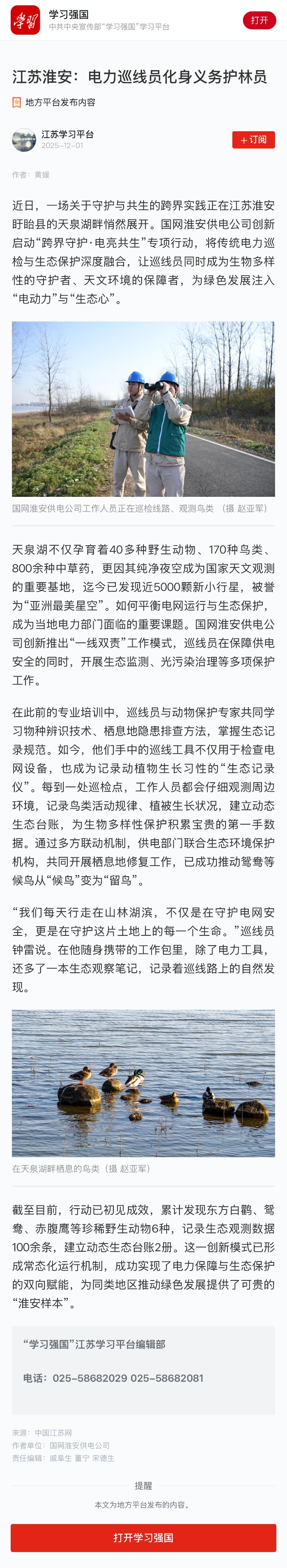 学习强国:江苏淮安 电力巡线员化身义务护林员