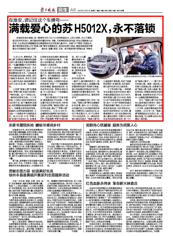 在淮安,请记住这个车牌号—— 满载爱心的苏H5012X,永不落锁 在淮安的街头巷尾,有一辆牌号为苏H5012X的特殊面包车,之所以特殊,它从不落锁,路过的市民若有心,便可随时将闲置的衣物、书籍、文具等物资放进车里;而当它满载爱心出发时,又会把这份温暖精准送达需要帮助的农村困境儿童手中。这辆“永不落锁”的面包车,属于国网淮安供电公司“海棠心愿”青年志愿服务队,是流动的爱心驿站,更是串联起城市善意与乡村期盼的“暖心纽带”。 通讯员 程曦 顾迎 王强 扬子晚报/紫牛新闻记者 朱鼎兆 12月23日,寒意渐浓,“海棠心愿”志愿者金增晖和张晶辉正细心清点面包车里的捐赠物资:一包叠得整整齐齐的干净衣物、一盏崭新的护眼台灯、几本图文并茂的课外书,还有一叠带着油墨香的练习本。“这些都是市民近期送来的爱心物质,我们打算趁休息时间,把它们送到30公里外的涟水县涟城街道石庄村小羽(化名)家。”金增晖介绍。 小羽是“海棠心愿”志愿服务队“梦想小屋”改造计划的第3个帮扶对象。这个六年级女孩,一直和奶奶相依为命。二十多年前,小羽的父亲因车祸导致无法正常行走,留下癫痫等后遗症;母亲靠着在食堂理菜的微薄收入,支撑着全家的吃穿用度。昏暗狭小的房间里堆满杂物,小羽连一个安稳的学习角落都没有。自2024年10月“梦想小屋”改造计划启动以来,志愿者们坚持实地走访调研,精准对接每一户困境家庭的需求。了解到小羽的情况后,他们第一时间将其纳入改造名单。 从11月18日开始,志愿者们利用休息时间,一步步推进改造工作:清理房间杂物、精准测量尺寸、多方筹集物资、组装家具家电、布置装饰细节……近一个月的忙碌后,小羽原先杂乱的房间彻底“变身”——温暖清新的粉色墙面、稳固舒适的床、收纳有序的衣柜、宽敞实用的书桌,为小羽打造出一个明亮整洁的专属小天地。 “我们要做的不仅是送物资,更是要给孩子们创造一个真正属于自己的学习空间,守护他们的成长梦想。”服务队领衔人梁玉芹的话语,道出了“梦想小屋”计划的初心。12月24日中午,金增晖和张晶辉再次驱车前往小羽家,这次他们带来的不是装修材料,而是填满“梦想”的爱心物资。两人小心翼翼地将课外书、小熊娃娃等摆件摆上书架,把衣物整齐挂进衣柜,新房间变得温馨又充实。 小羽下午放学后回到家,一推开门,脚步瞬间停住了。她的目光落在书桌上,那里整齐摆放着崭新的课外书和新文具盒,指尖轻轻拂过护眼台灯的灯杆,眼睛里闪烁着惊喜的光芒,“我以后要在这里写作业,看很多很多书!” 这份温暖的守护,并非一时兴起。“海棠心愿”青年志愿服务队的故事,要从2013年说起。这支最初由20余名国网淮安供电公司青年员工组成的队伍,队伍不断发展壮大,如今已拥有1850余名成员。从一辆流动的爱心面包车起步,“海棠心愿”的公益版图不断拓展,形成了涵盖物资帮扶、环境改造、成长陪伴、能力提升的多元化公益体系。 十三年深耕不辍,一串串数字见证着这份坚守与担当:累计开展志愿服务活动2000余次,帮扶困境儿童3500余名;帮助50余户因病致贫的乡亲修缮危房,助力100余户困难家庭通过养殖实现增产增收;为200余户家庭改造电路,守护用电安全;组织红色研学活动190余场,播撒爱国种子;260名志愿者与困境儿童结对帮扶,开展550余场安全用电进校园活动;用1721张“海棠心愿卡”,一一圆了孩子们的微心愿。值得一提的是,这份爱心还跨越山海,志愿者们发起“海棠心愿·点亮小课桌”爱心助学活动,将善款和物资送到西藏当雄、那曲等地的孩子们手中,让温暖在雪域高原流淌。 如今,“海棠心愿”已成为淮安公益领域的闪亮名片,团队中更涌现出多名“中国好人”、全国人大代表、全国劳模和省级优秀志愿者。2025年1月,“海棠心愿”慈善基金会正式成立,进一步整合资源,为公益事业的长效发展注入新动能。(程曦 顾迎 王强 朱鼎兆)