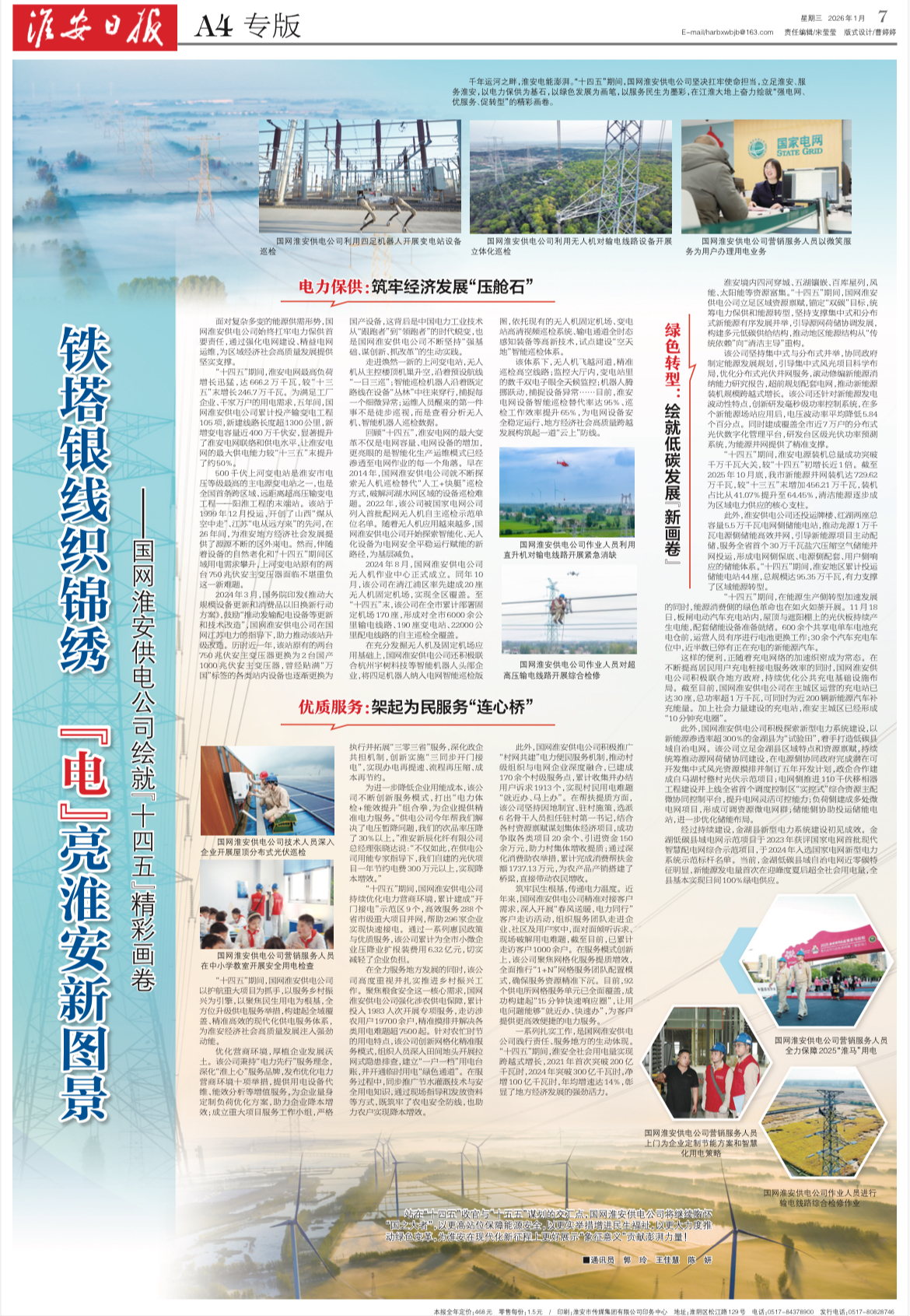 铁塔银线织锦绣 “电”亮淮安新图景 ——国网淮安供电公司绘就“十四五”精彩画卷 千年运河之畔,淮安电能澎湃。“十四五”期间,国网淮安供电公司坚决扛牢使命担当,立足淮安、服务淮安,以电力保供为基石,以绿色发展为画笔,以服务民生为墨彩,在江淮大地上奋力绘就“强电网、优服务、促转型”的精彩画卷。 电力保供:筑牢经济发展“压舱石” 面对复杂多变的能源供需形势,国网淮安供电公司始终扛牢电力保供首要责任,通过强化电网建设、精益电网运维,为区域经济社会高质量发展提供坚实支撑。 “十四五”期间,淮安电网最高负荷增长迅猛,达666.2万千瓦,较“十三五”末增长246.7万千瓦。为满足工厂企业、千家万户的用电需求,五年间,国网淮安供电公司累计投产输变电工程105项,新建线路长度超1300公里,新增变电容量近400万千伏安,显著提升了淮安电网联络和供电水平,让淮安电网的最大供电能力较“十三五”末提升了约50%。 500千伏上河变电站是淮安市电压等级最高的主电源变电站之一,也是全国首条跨区域、远距离超高压输变电工程——阳淮工程的末端站。该站于1999年12月投运,开创了山西“煤从空中走”、江苏“电从远方来”的先河,在26年间,为淮安地方经济社会发展提供了源源不断的区外来电。然而,伴随着设备的自然老化和“十四五”期间区域用电需求攀升,上河变电站原有的两台750兆伏安主变压器面临不堪重负这一新难题。 2024年3月,国务院印发《推动大规模设备更新和消费品以旧换新行动方案》,鼓励“推动发输配电设备等更新和技术改造”,国网淮安供电公司在国网江苏电力的指导下,助力推动该站升级改造。历时近一年,该站原有的两台750兆伏安主变压器更换为2台国产1000兆伏安主变压器,曾经贴满“万国”标签的各类站内设备也逐渐更换为国产设备,这背后是中国电力工业技术从“跟跑者”到“领跑者”的时代蜕变,也是国网淮安供电公司不断坚持“强基础、谋创新、抓改革”的生动实践。 走进焕然一新的上河变电站,无人机从主控楼顶机巢升空,沿着预设航线“一日三巡”;智能巡检机器人沿着既定路线在设备“丛林”中往来穿行,捕捉每一个细微异常;运维人员醒来的第一件事不是徒步巡视,而是查看分析无人机、智能机器人巡检数据。 回顾“十四五”,淮安电网的最大变革不仅是电网容量、电网设备的增加,更亮眼的是智能化生产运维模式已经渗透至电网作业的每一个角落。早在2014年,国网淮安供电公司就不断探索无人机巡检替代“人工+快艇”巡检方式,破解河湖水网区域的设备巡检难题。2022年,该公司被国家电网公司列入首批配网无人机自主巡检示范单位名单。随着无人机应用越来越多,国网淮安供电公司开始探索智能化、无人化设备为电网安全平稳运行赋能的新路径,为基层减负。 2024年8月,国网淮安供电公司无人机作业中心正式成立。同年10月,该公司在清江浦区率先建成20座无人机固定机场,实现全区覆盖。至“十四五”末,该公司在全市累计部署固定机场170座,形成对全市6000余公里输电线路、190座变电站、22000公里配电线路的自主巡检全覆盖。 在充分发掘无人机及固定机场应用基础上,国网淮安供电公司还积极联合杭州宇树科技等智能机器人头部企业,将四足机器人纳入电网智能巡检版图,依托现有的无人机固定机场、变电站高清视频巡检系统、输电通道全时态感知装备等高新技术,试点建设“空天地”智能巡检体系。 该体系下,无人机飞越河道,精准巡检高空线路;监控大厅内,变电站里的数千双电子眼全天候监控;机器人腾挪跃动,捕捉设备异常……目前,淮安电网设备智能巡检替代率达95%、巡检工作效率提升65%,为电网设备安全稳定运行、地方经济社会高质量跨越发展构筑起一道“云上”防线。 优质服务:架起为民服务“连心桥” “十四五”期间,国网淮安供电公司以护航重大项目为抓手,以服务乡村振兴为引擎,以聚焦民生用电为根基,全方位升级供电服务举措,构建起全域覆盖、精准高效的现代化供电服务体系,为淮安经济社会高质量发展注入强劲动能。 优化营商环境,厚植企业发展沃土。该公司秉持“电力先行”服务理念,深化“淮上心”服务品牌,发布优化电力营商环境十项举措,提供用电设备代维、能效分析等增值服务,为企业量身定制负荷优化方案,助力企业降本增效;成立重大项目服务工作小组,严格执行并拓展“三零三省”服务,深化政企共担机制,创新实施“三同步开门接电”,实现办电再提速、流程再压缩、成本再节约。 为进一步降低企业用能成本,该公司不断创新服务模式,打出“电力体检+能效提升”组合拳,为企业提供精准电力服务。“供电公司今年帮我们解决了电压暂降问题,我们的次品率压降了30%以上。”淮安新辰化纤有限公司总经理张晓达说:“不仅如此,在供电公司用能专家指导下,我们自建的光伏项目一年节约电费300万元以上,实现降本增效。” “十四五”期间,国网淮安供电公司持续优化电力营商环境,累计建成“开门接电”示范区9个,高效服务288个省市级重大项目并网,帮助296家企业实现快速接电。通过一系列惠民政策与优质服务,该公司累计为全市小微企业压降业扩报装费用6.32亿元,切实减轻了企业负担。 在全力服务地方发展的同时,该公司高度重视并扎实推进乡村