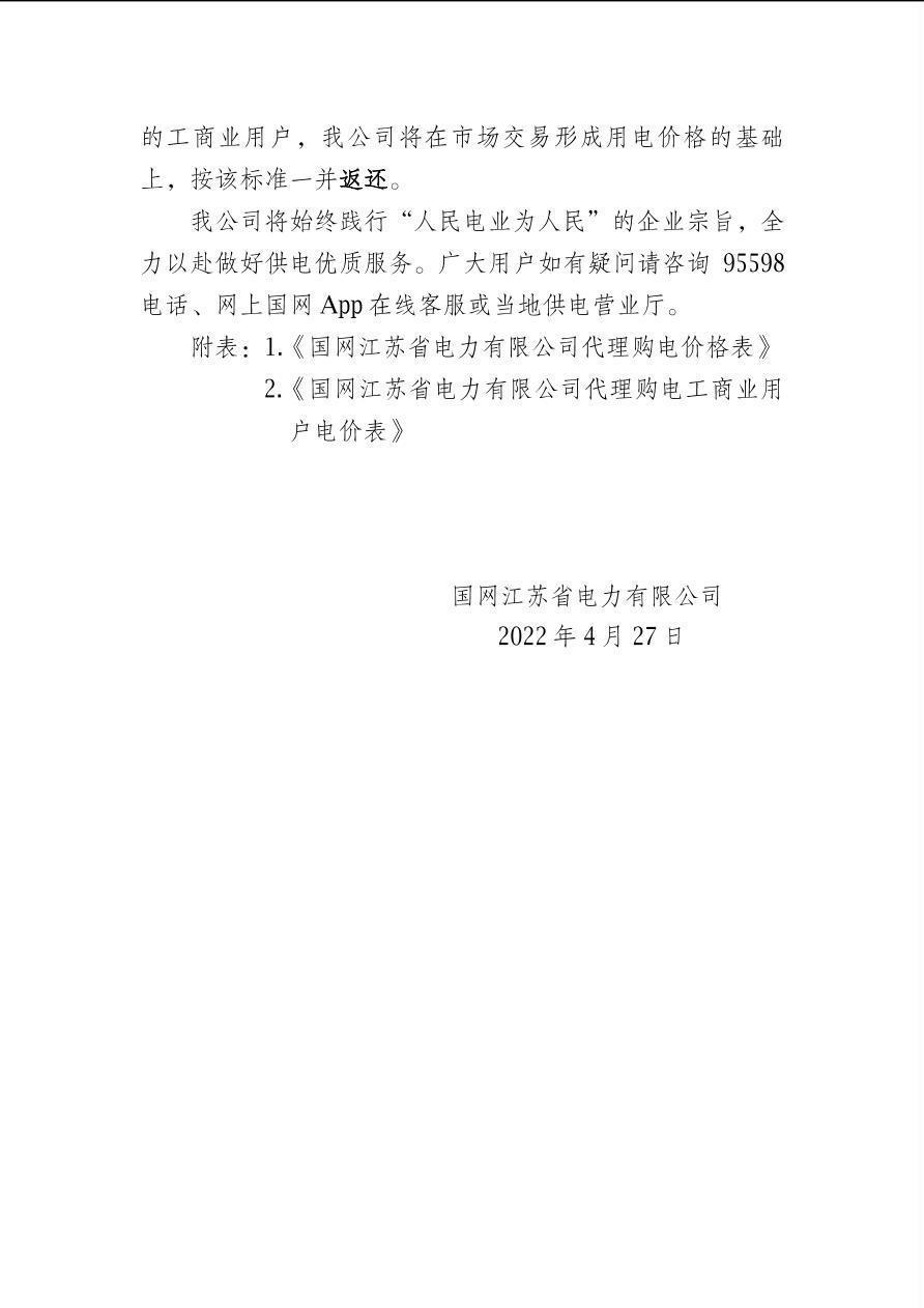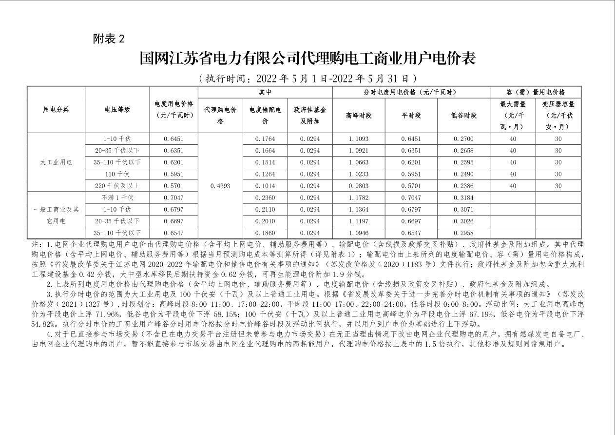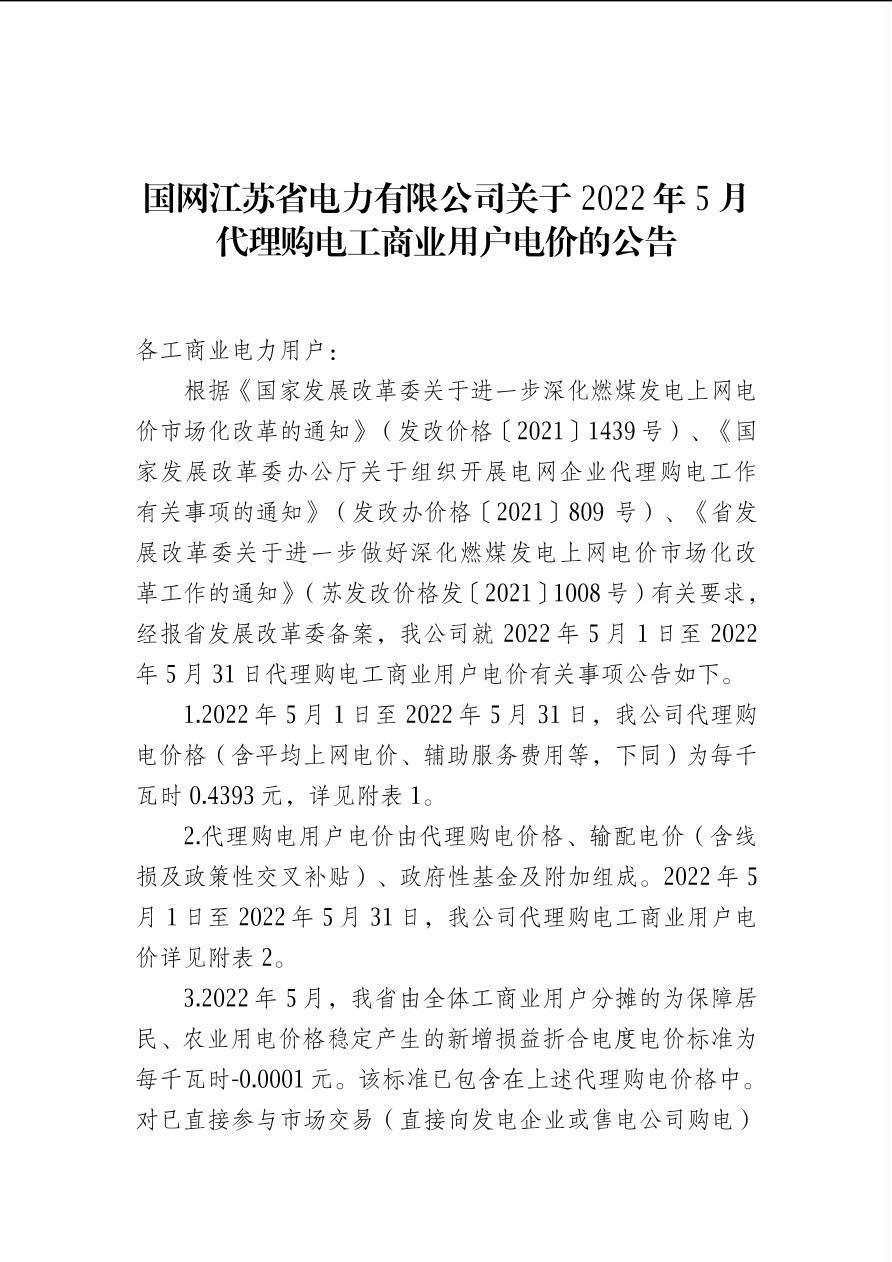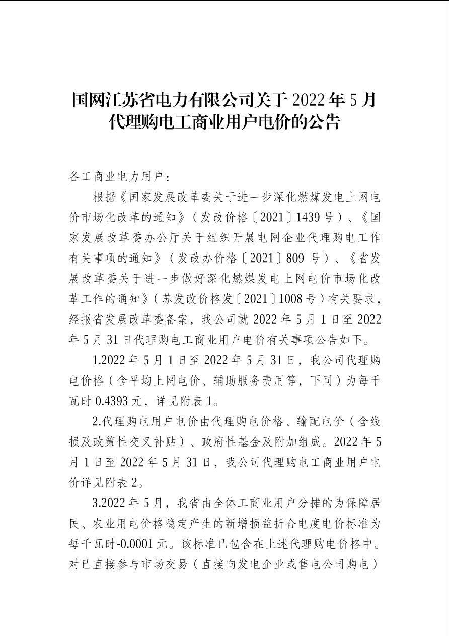 国网江苏省电力有限公司关于2022年5月代理购电工商业用户电价的公告