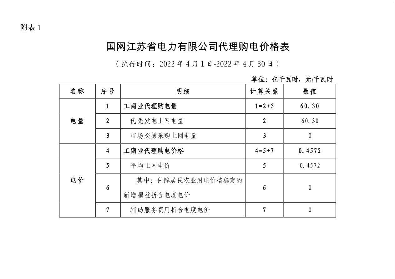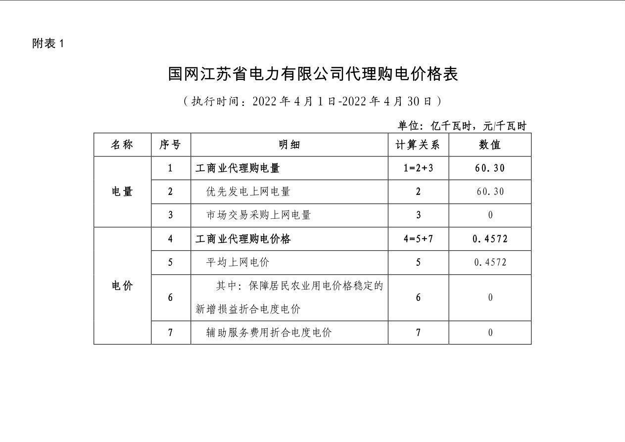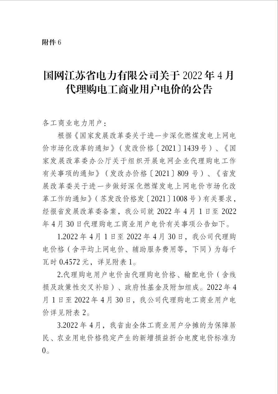 国网江苏省电力有限公司关于2022年4月代理购电工商业用户电价的公告