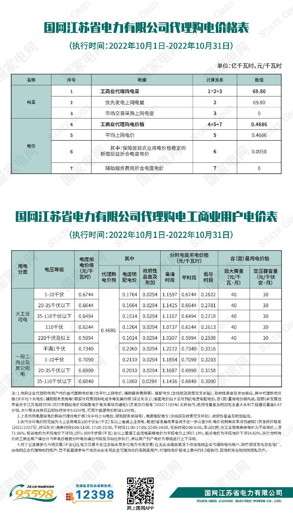 国网江苏省电力有限公司关于2022年10月代理购电工商业用户电价的公告