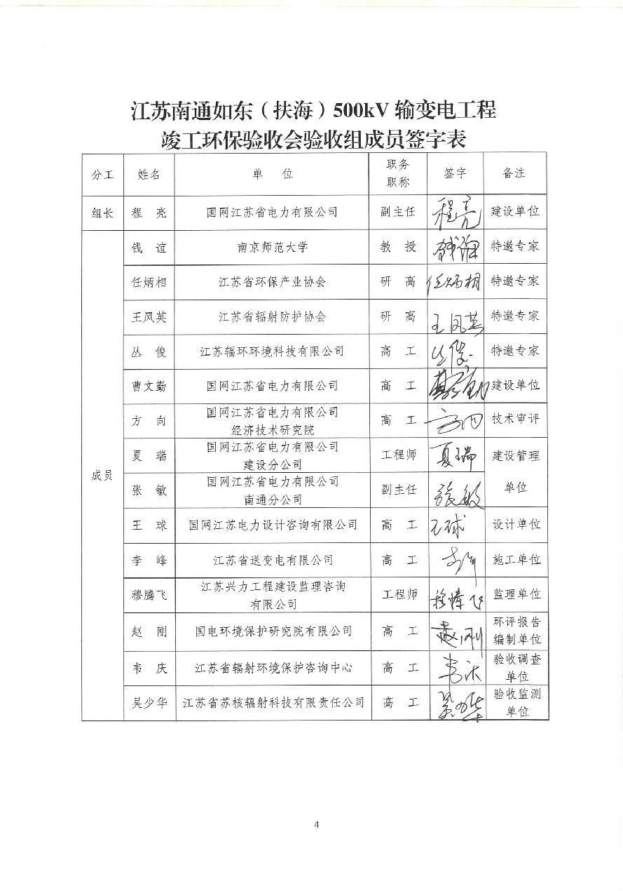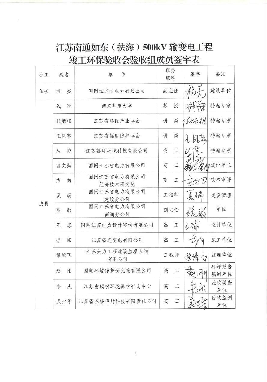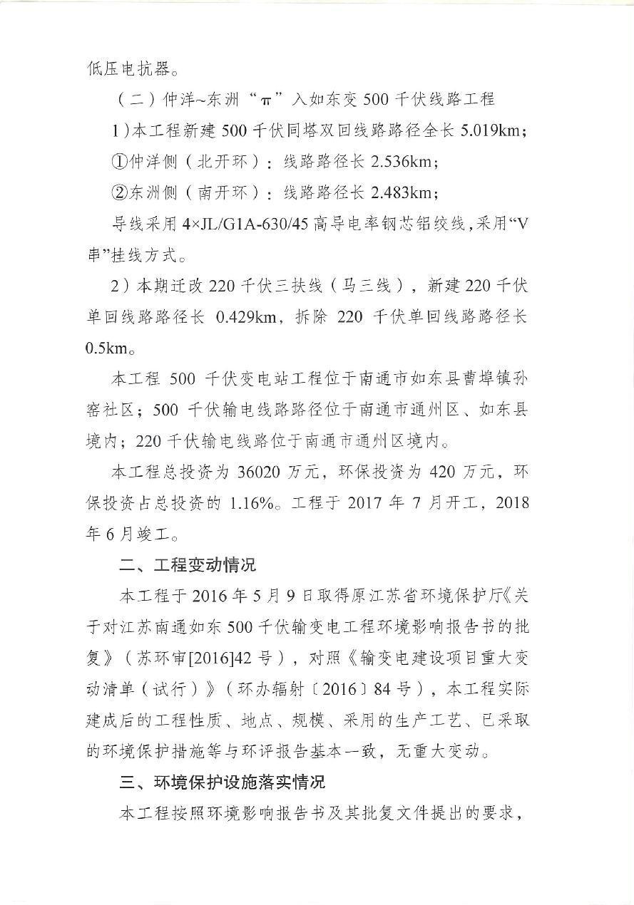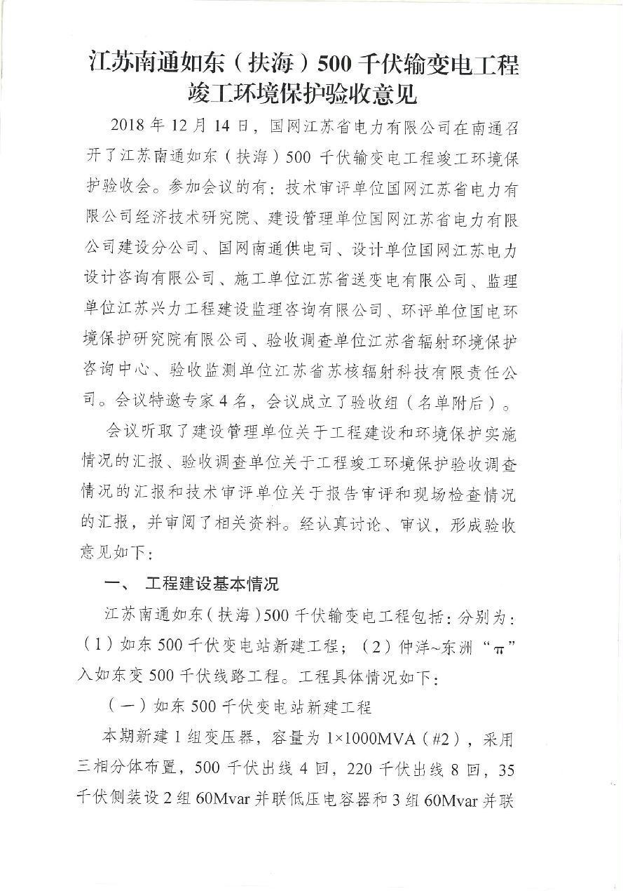 江苏南通500kV如东输变电工程竣工环保验收意见