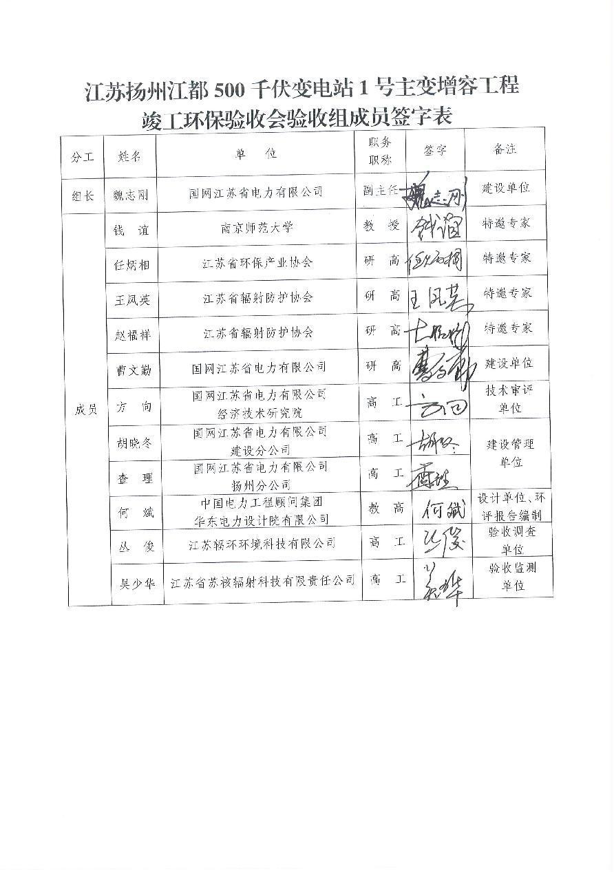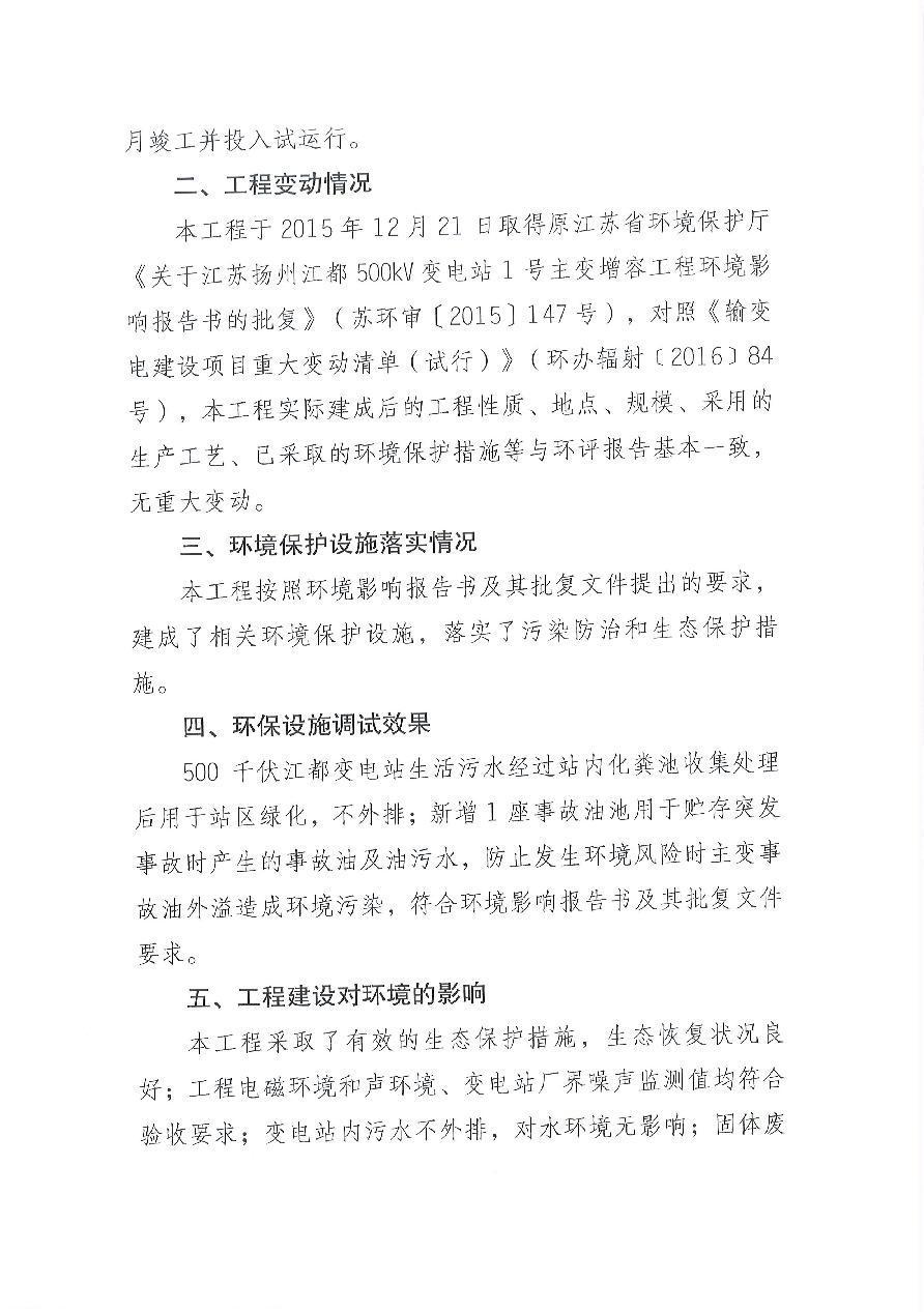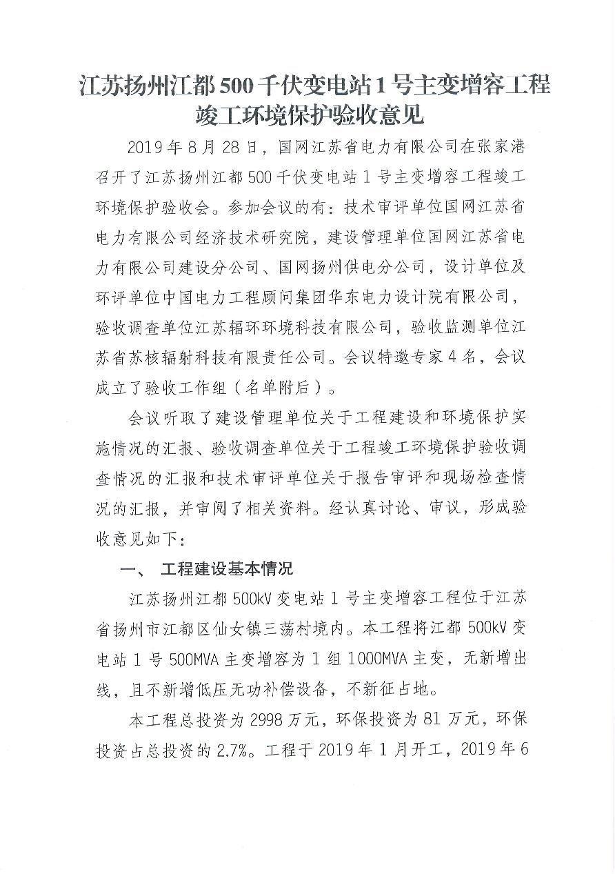 江苏扬州江都500kV变电站1号主变增容工程竣工环境保护验收意见