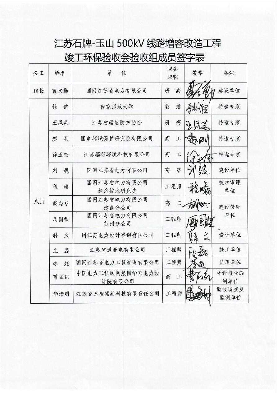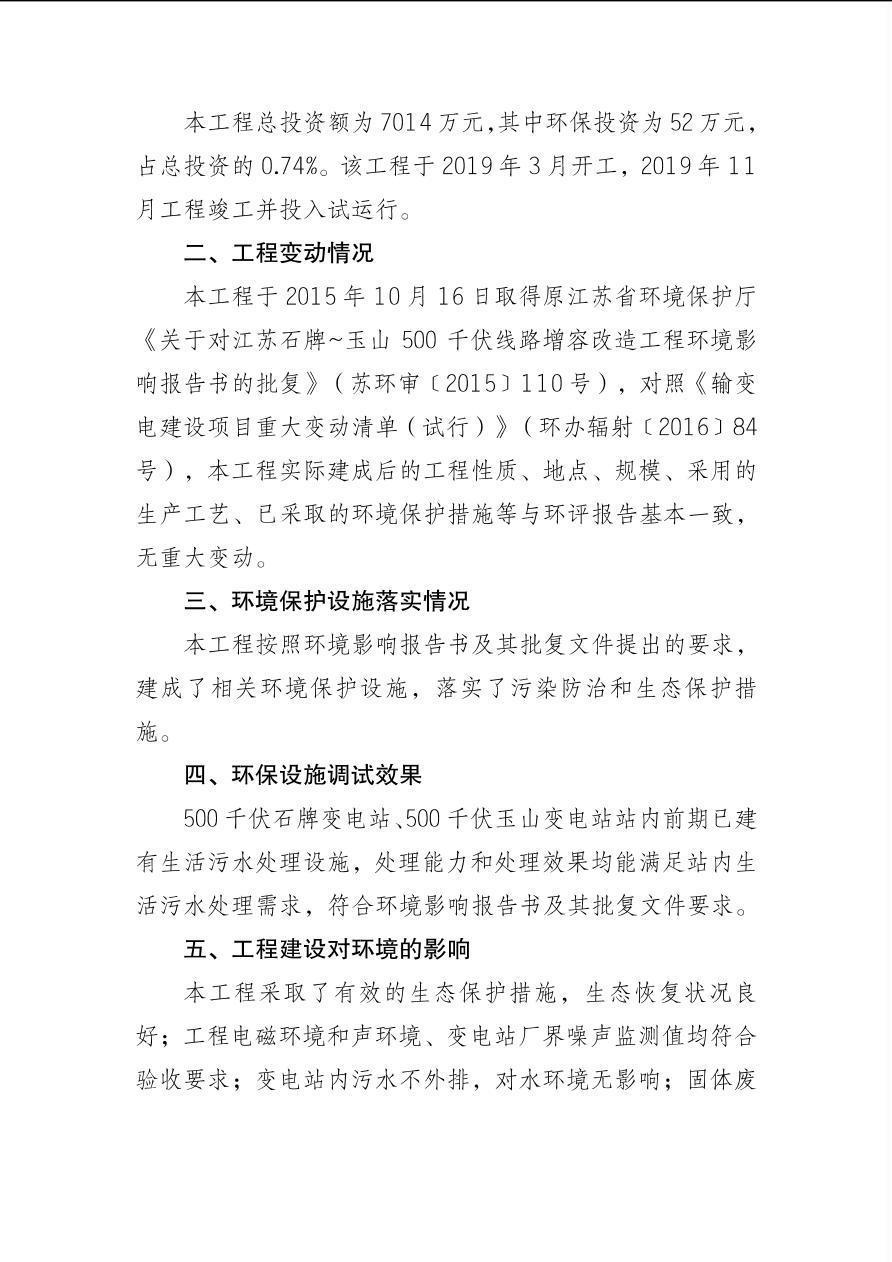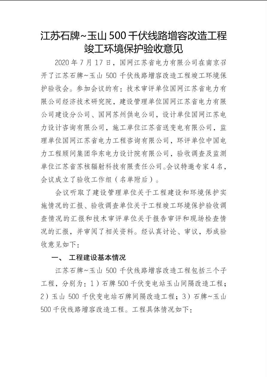 江苏石牌~玉山500kV线路增容改造工程竣工环境保护验收意见