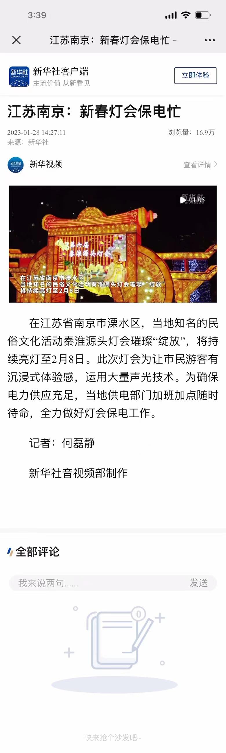 在江苏省南京市溧水区,当地知名的民俗文化活动秦淮源头灯会璀璨“绽放”,将持续亮灯至2月8日。此次灯会为让市民游客有沉浸式体验感,运用大量声光技术。为确保电力供应充足,当地供电部门加班加点随时待命,全力做好灯会保电工作
