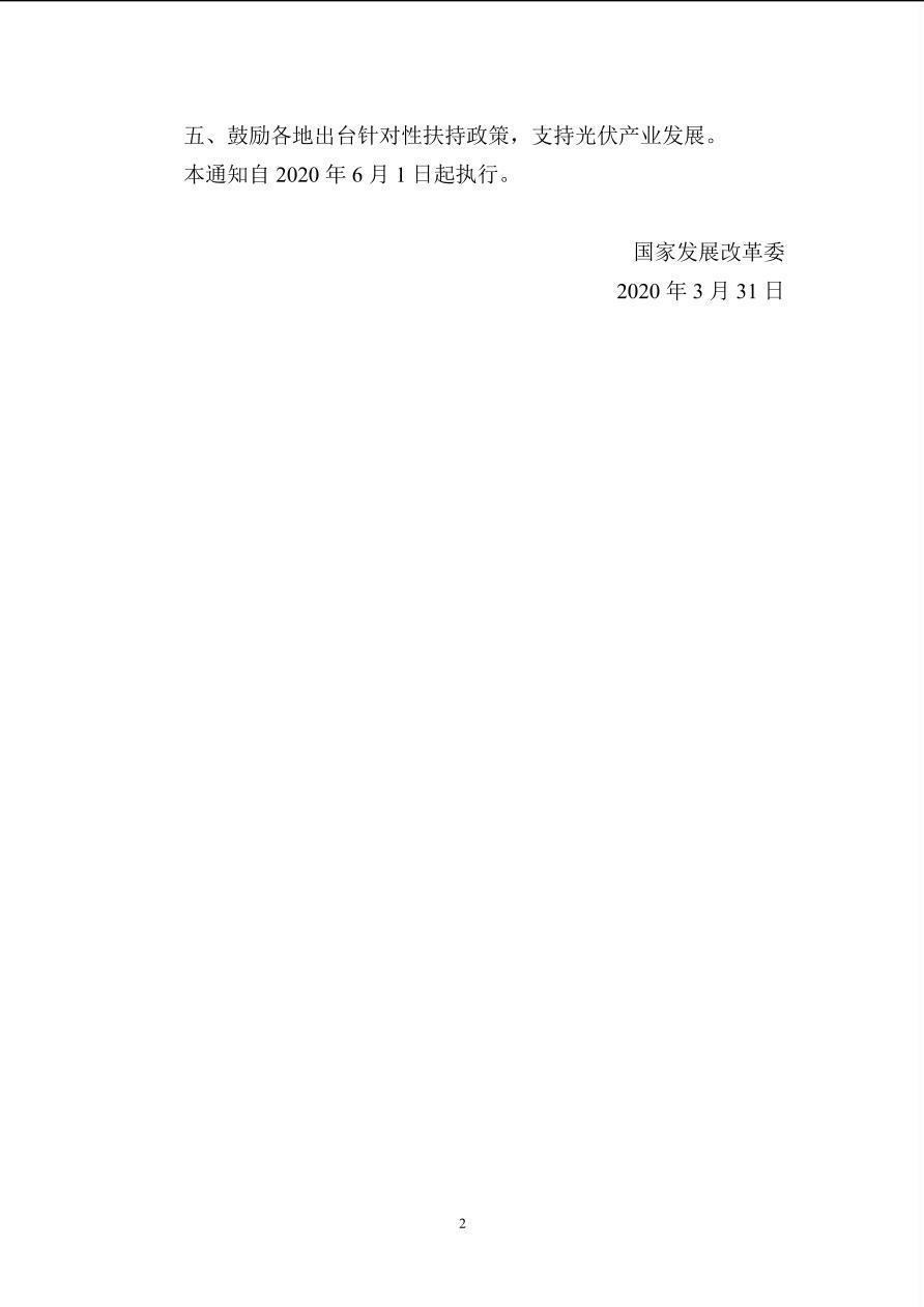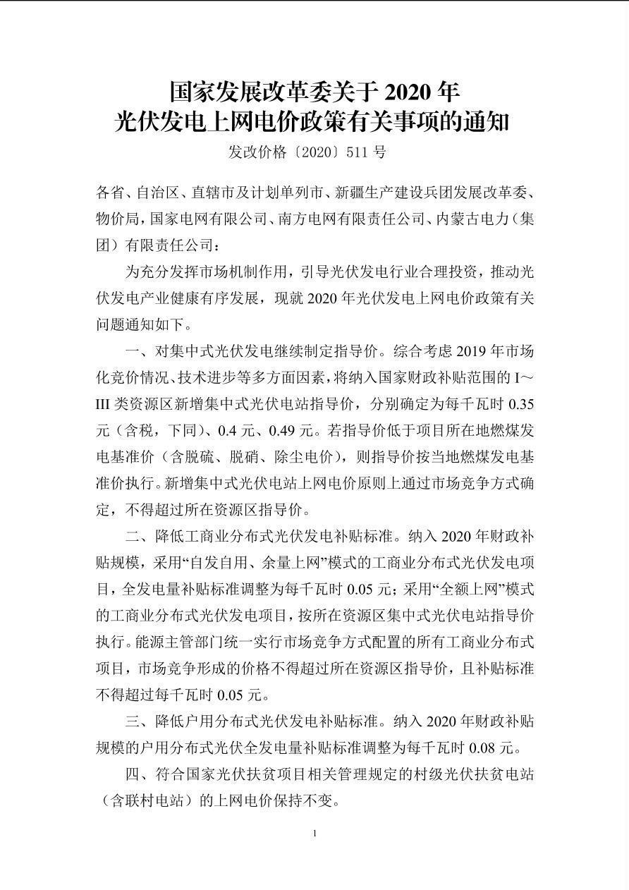 国家发展改革委关于2020年光伏发电上网电价政策有关事项的通知(发改价格〔2020〕511号)