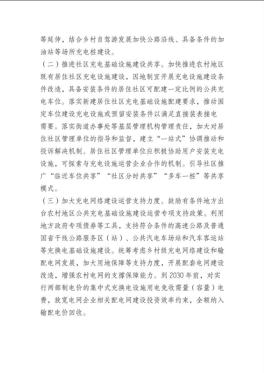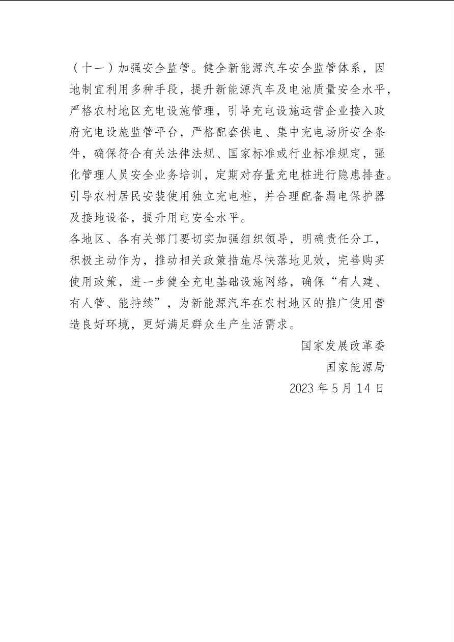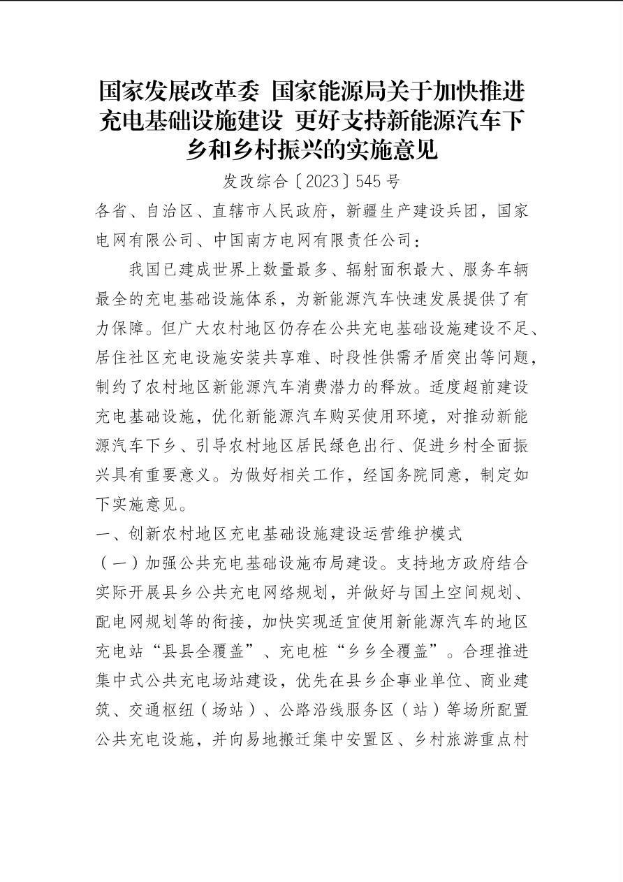 国家发展改革委 国家能源局关于加快推进充电基础设施建设 更好支持新能源汽车下乡和乡村振兴的实施意见(发改综合〔2023〕545号)