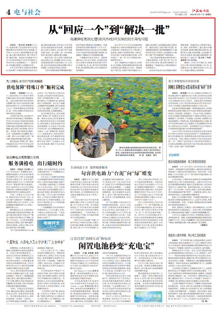 9月3日,南通市海门区包场供电所台区经理陆曙华和同事再次前往包场镇,对刘浩14号台区计量表箱整改进行复查,确认箱内接线规范、箱门密封严密、接地可靠。该处电力设施是今年8月5日《政风热线》节目中所反映的13项农村电力设施隐患之一。截至目前,所有曝光隐患已全部整改完毕。 针对节目中群众反映的电表箱老旧、配电箱下方堆放杂物等用电安全问题,国网南通市海门区供电公司当天即启动全面排查和综合治理。除直接更换公司资产设备外,还对客户资产设备实施“发现一起、处置一起”,同步报备政府、联合督办,确保处理无遗漏。 截至目前,该公司累计清理设备周边杂物21处,新增警示标识120处,改造离地距离不足配电箱27台,对沿路、临近民居的配电箱加装警示牌与防撞条,全面强化用电安全防护。 节目中反映的海安市雅周镇东夏村低压杆线安全隐患也已高效解决。在海安市政府及村委协调支持下,8月14日,国网海安市供电公司完成400伏东夏线79487号电杆杆线迁移和接户线改造,有效解决了道路安全与用电隐患问题。 个案整改完成并非终点。国网南通供电公司以此为契机,启动配农网电力设施安全隐患攻坚治理专项行动,构建“查、改、验、销”四步闭环管理机制,推动隐患治理从单点处置转向系统管控。 该公司于8月19日正式实施《国网南通供电公司配农网隐患排查与分级分类指南》,将缺陷划分为7类设备、6类风险,涵盖18种典型场景,为配电、农电及客户设备排查提供依据,并同步建立“一患一档”全口径隐患台账,确保责任到人。 此外,南通供电公司通过无人机航拍、红外测温、局放检测等多种手段开展全面排查,重大隐患立行立改,一般缺陷纳入“周计划、月滚动”常态化整改,专人跟踪、逐项销号,实现隐患治理全过程闭环。整改完成后,及时开展“回头看”,系统梳理治理成效、剖析管理薄弱环节,编制形成专项工作报告,总结提炼出可复制、可推广的“南通经验”与典型做法。 “我们将配网隐患治理成效纳入关键业绩考核、月度‘挣工资’及工作执行力评价体系,推动责任真落实、问题真解决。”南通供电公司配网部副主任罗勇表示。 政企协同也成为此次隐患治理的重要支撑。南通供电公司积极对接公安、消防、市政等部门,建立重点问题及时报备、敏感问题定期会商机制,构建“群众点题、政府领题、企业答题”的良性互动格局,推动解决通道堆积、树线矛盾与“三线交叉”(电力线、广电线、通信线)等长期难题。 据统计,专项工作开展以来,南通全市已累计排查各类隐患11387处,完成整治4607处,整改完成率40.45%,其中67处重大隐患已全部清零。