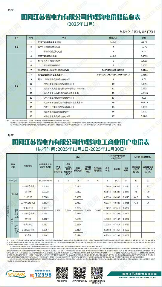 国网江苏省电力有限公司关于2025年11月代理购电工商业用户电价的公告
