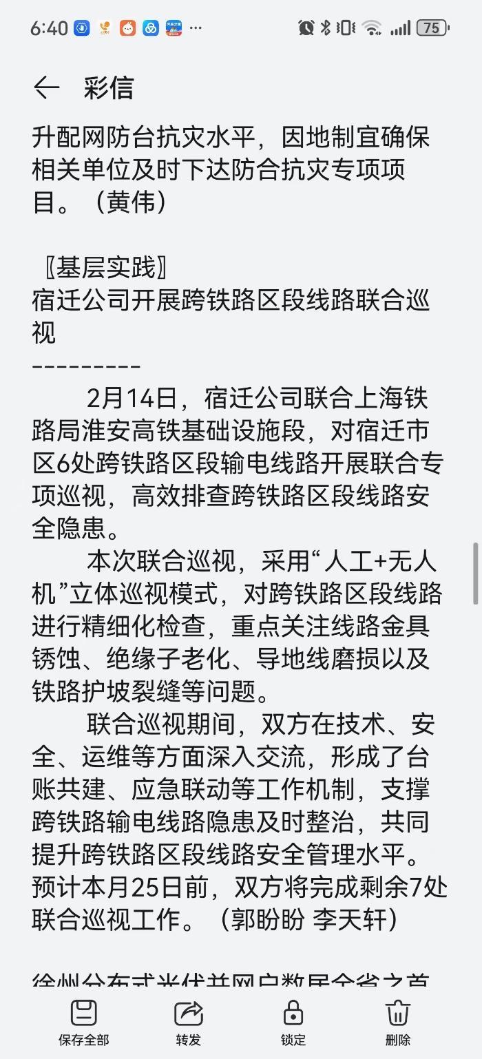 手机报:宿迁公司开展跨铁路区段线路联合巡视