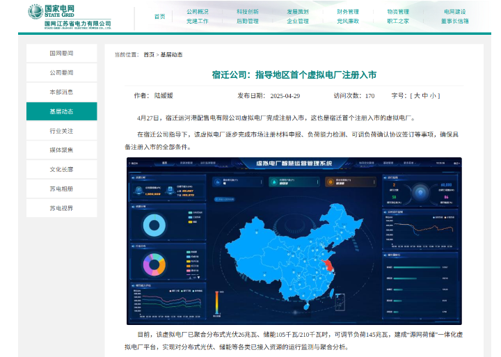 4月27日,宿迁运河港配售电有限公司虚拟电厂完成注册入市,这也是宿迁首个注册入市的虚拟电厂。
