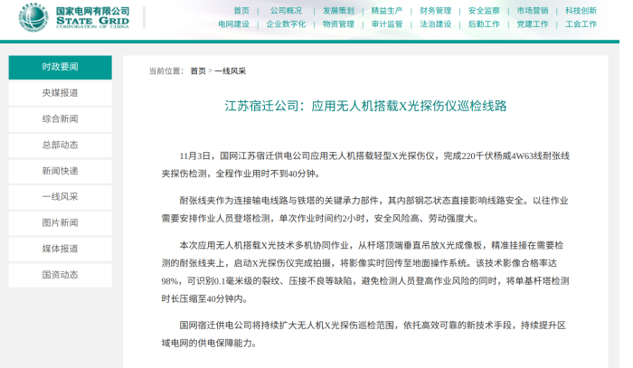 11月3日,国网江苏宿迁供电公司应用无人机搭载轻型X光探伤仪,完成220千伏杨威4W63线耐张线夹探伤检测,全程作业用时不到40分钟。 耐张线夹作为连接输电线路与铁塔的关键承力部件,其内部钢芯状态直接影响线路安全。以往作业需要安排作业人员登塔检测,单次作业时间约2小时,安全风险高、劳动强度大。 本次应用无人机搭载X光技术多机协同作业,从杆塔顶端垂直吊放X光成像板,精准挂接在需要检测的耐张线夹上,启动X光探伤仪完成拍摄,将影像实时回传至地面操作系统。该技术影像合格率达98%,可识别0.1毫米级的裂纹、压接不良等缺陷,避免检测人员登高作业风险的同时,将单基杆塔检测时长压缩至40分钟内。 国网宿迁供电公司将持续扩大无人机X光探伤巡检范围,依托高效可靠的新技术手段,持续提升区域电网的供电保障能力。