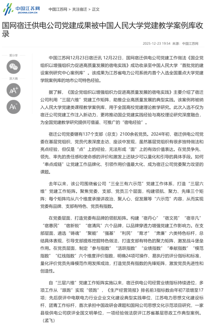 中国江苏网12月23日宿迁讯 12月22日,国网宿迁供电公司党建工作做法《国企党组织以增强组织力促进高质量发展的宿电实践》成功收录至中国人民大学“首批党的建设案例研究中心案例库”。该成果为江苏省电力公司系统内首个入选全国重点大学党建学院案例库的地市公司特色经验。 据了解,《国企党组织以增强组织力促进高质量发展的宿电实践》主要介绍了宿迁公司利用“三层六维”党建工作矩阵,助推企业高质量发展的典型实践。该案例将被纳入人民大学党建类课程教学案例库,用于全国高校党建理论教学研究。此次入选不仅为宿迁公司党建工作注入新动力,更将推动国企党建实践经验与高校理论研究深度融合,为全国党建教学研究提供可借鉴、可推广的“宿电经验”。 宿迁公司党委辖有137个支部(总支)2100余名党员。2024年初,宿迁供电公司党委在基层党组织、党员代表深度走访、座谈中发现,虽然基层党组织有很多独特做法和亮点经验,但仅是“点”上的经验,无法形成“面”上的有效价值表达。在党员争先、领先、率先的责任感和使命感的评价和激发上还缺少可以量化和引导的具体手段。如何“串点成链”让党建工作品牌化、引领作用价值最大化,成为宿迁公司党委聚力攻坚的课题。 去年以来,该公司围绕省公司“三全三有六示范”党建工作体系,打造“三层六维”党建工作矩阵。聚焦党委、支部、党员三个层面,构建领航、聚力、先锋三个矩阵;每个矩阵均从六个维度承接讲政治、聚人心、促发展等“六示范”内容,从而实现党委有品牌、支部有特色、党员有指数。 在党委层面,打造党委有品牌的领航矩阵。构建“宿丹心”“宿文苑”“宿非凡”“宿惠民”“宿新锐”“宿清风”六个品牌,以品牌穿透力增强党建工作影响力。在支部层面,遴选“铸魂”“聚能”“强基”“利民”“育才”“肃廉”六类特色标杆,总结具体表现,引导支部提炼挖掘特色做法,打造支部有特色的聚力矩阵,激发战斗堡垒作用。在党员层面,制定“参与指数”“活跃指数”“业绩指数”“奉献指数”“模范指数”“红线指数”六个维度评价指数,明确24项可操作、易执行的评分指标和标准,量化评价党员先锋模范作用发挥成效,打造党员有指数的先锋矩阵,激发党员先进性和创造性。 自“三层六维”党建工作矩阵实施以来,宿迁供电公司经营业绩指标持续进位,多项工作从“跟跑”实现“领跑”,《生产经营简报》排名前3指标数由年初7项增至17项;先后获评中电联电力行业企业文化建设典型实践单位、江苏电力思想文化建设标杆、团青工作标杆,首次承担中国政研会课题和国网公司思想文化示范项目研究,一家县级供电公司获评全国文明单位,一项经验做法获评江苏省基层思政工作典型案例。(孟飞) 稿件来源:中国江苏网 一审一校: 陆媛媛 二审二校: 孟飞 三审三校: 胡薇薇