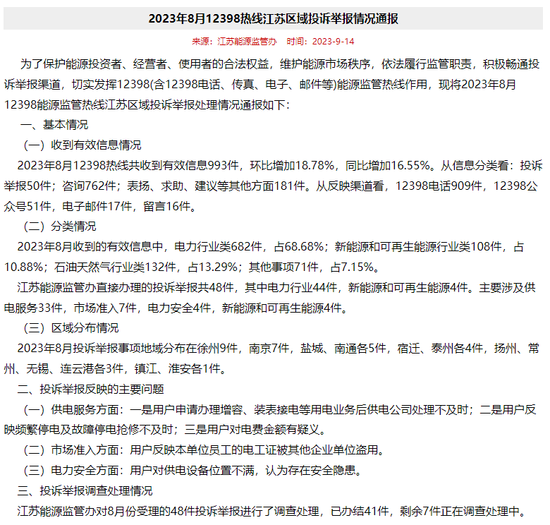 2023年8月12398热线江苏区域投诉举报情况通报