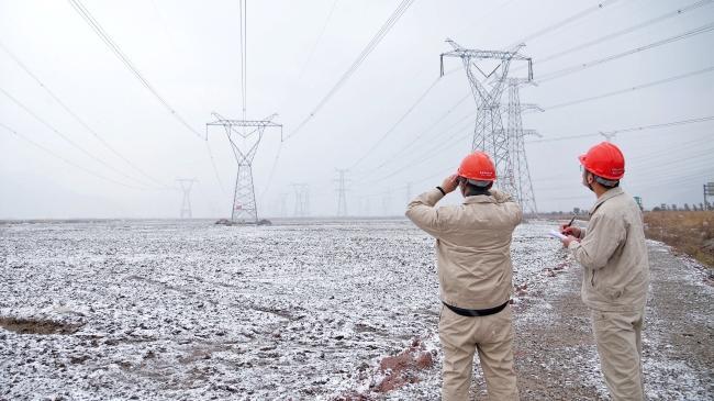 1月14日,国网连云港供电公司工作人员正在特巡密集的田湾核电站500千伏向外输电通道。(李容刚)