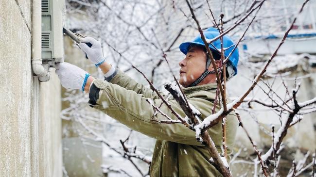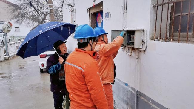1月15日,苏州临湖供电所工作人员冒雪来到浦庄村一户80多岁的高龄老人家中抢修,为其更换保护开关,及时恢复供电。(张静)