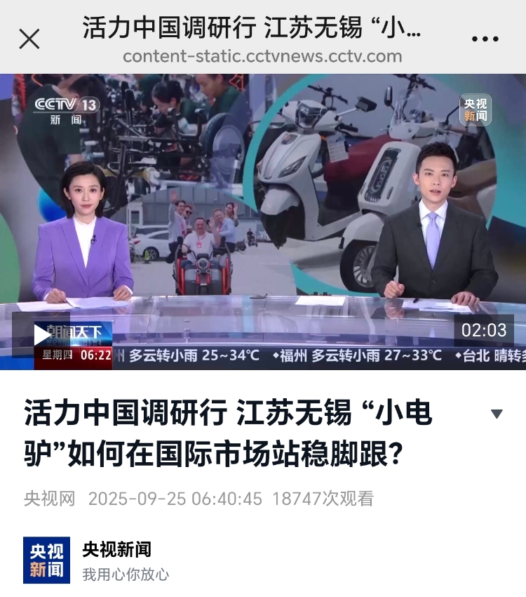9月25日 央视新闻频道《朝闻天下》栏目播发《活力中国调研行 江苏无锡“小电驴”如何在国际市场站稳脚跟?》