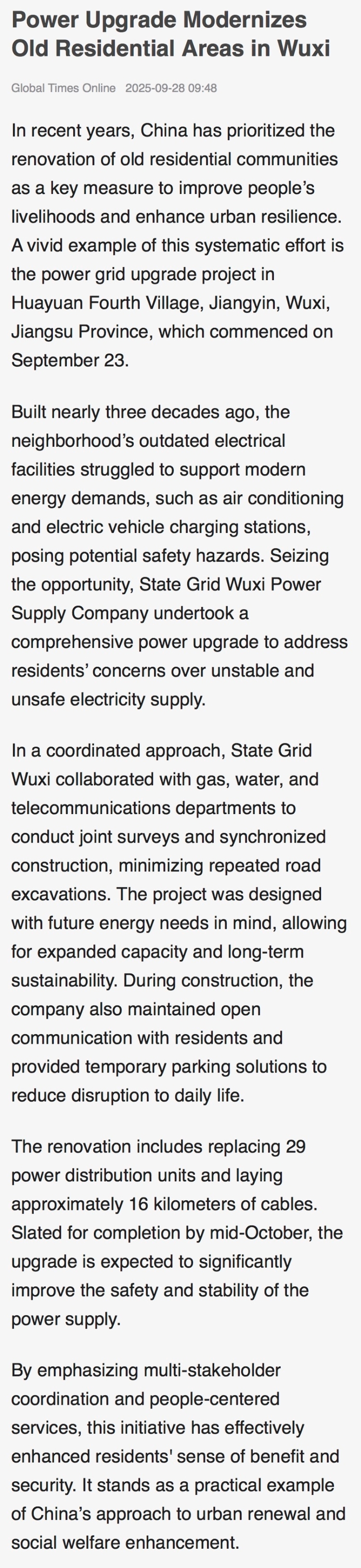 9月28日 环球网刊发《Power Upgrade Modernizes Old Residential Areas in Wuxi》