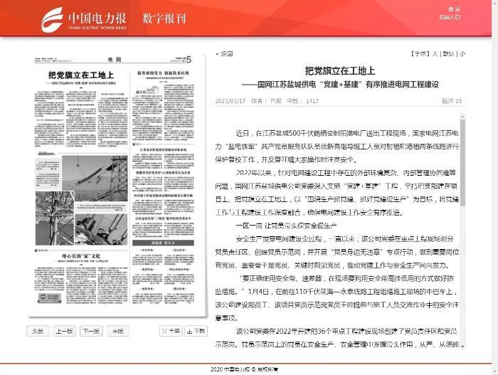 中国电力报:把党旗立在工地上——国网江苏盐城供电“党建+基建”有序推进电网工程建设