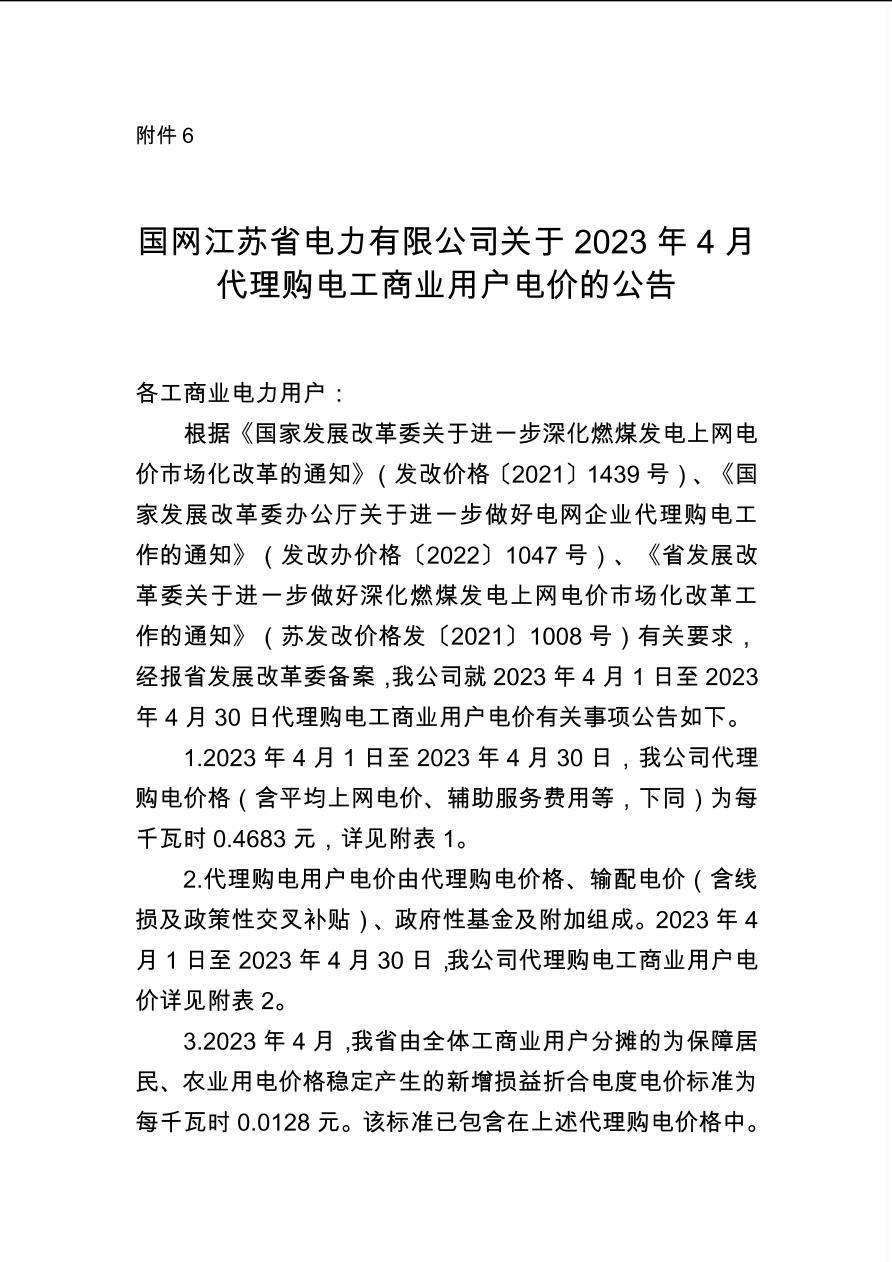 国网江苏省电力有限公司关于2023年4月代理购电工商业用户电价的公告
