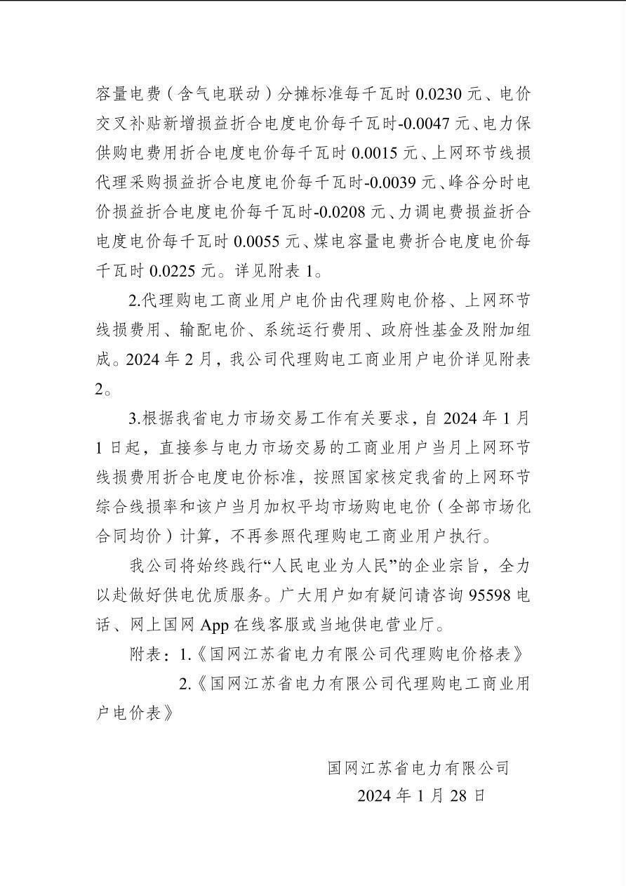 国网江苏省电力有限公司关于2024年2月代理购电工商业用户电价的公告