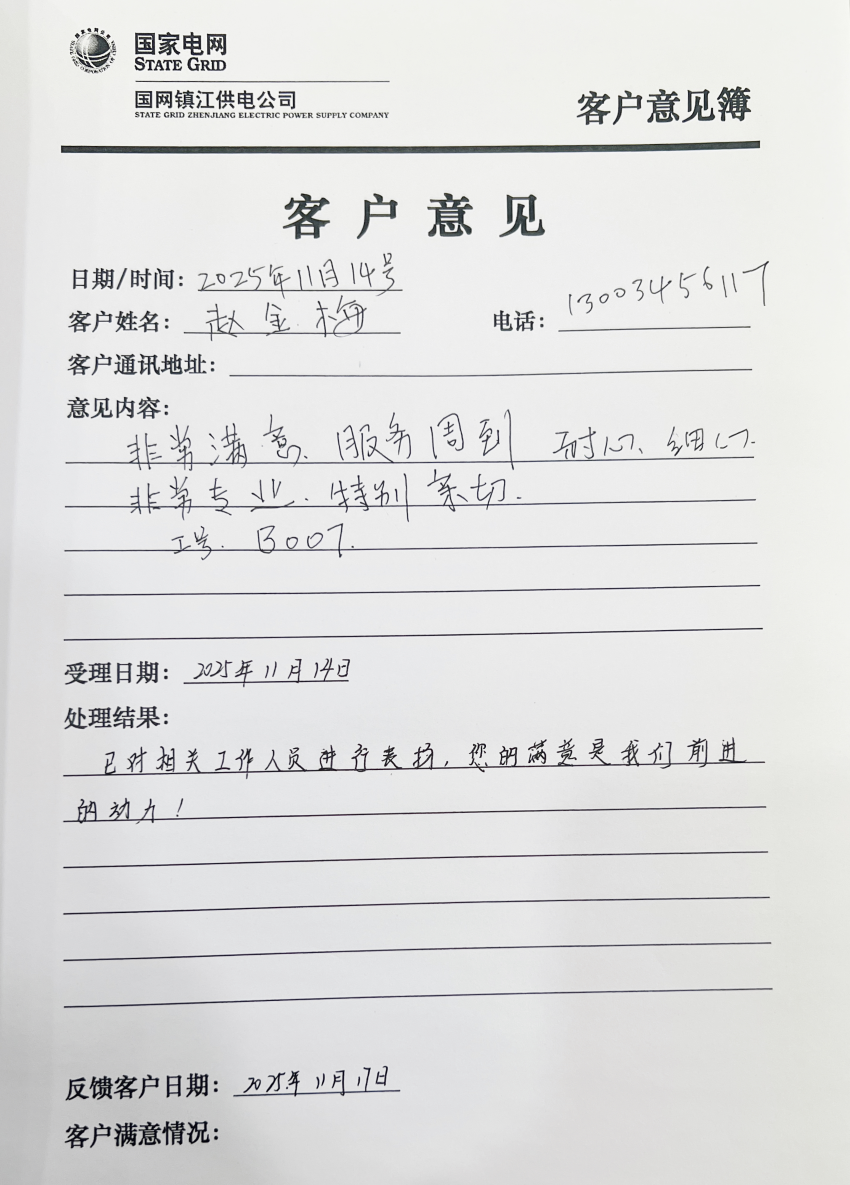 近日,丹徒供电服务中心的客户意见簿上,多了一页满是真情的手写评价——客户赵女士用“服务周到、耐心细心、非常专业、特别亲切”的质朴文字,为工号B007工作人员的服务打上了“非常满意”的标签。 当天,赵女士前往营业厅咨询办理用电业务。从进门引导、业务解答到流程办理,工号B007的工作人员全程耐心细致,主动帮助赵女士梳理所需资料、讲解政策细节、注意事项等。让原本对业务流程不熟悉的赵女士倍感安心。 “本来还担心手续复杂,没想到工作人员一步步讲得很清楚,态度又好,实在太省心了!”赵女士在事后感慨道。 这份好评并非偶然。长期以来,丹徒供电服务中心始终践行“以客户为中心”的服务理念,严格要求工作人员在业务办理中做到“主动问、耐心答、帮到底”,同时定期开展服务技能培训,从沟通技巧到专业能力全方位提升综合服务水平。 客户的肯定是前行的最大动力。接下来丹徒供电服务中心将持续深化“以客户为中心”的服务理念,将每一次好评转化为优质服务的具体行动,通过更细致、更专业的服务,让客户感受到更暖心的供电服务体验。