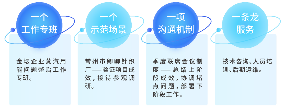 公司通过走访调研、问卷发放、会谈磋商等多种形式,与政府部门、合作伙伴、企业用户等利益相关方积极沟通,了解各方核心诉求、整合各方优势资源,成立“金坛企业蒸汽用能问题整治工作专班”,构建“四个一”组织保障体系,为企业量身定制解决方案,确保企业用汽问题治理“出真招、见实效”。
