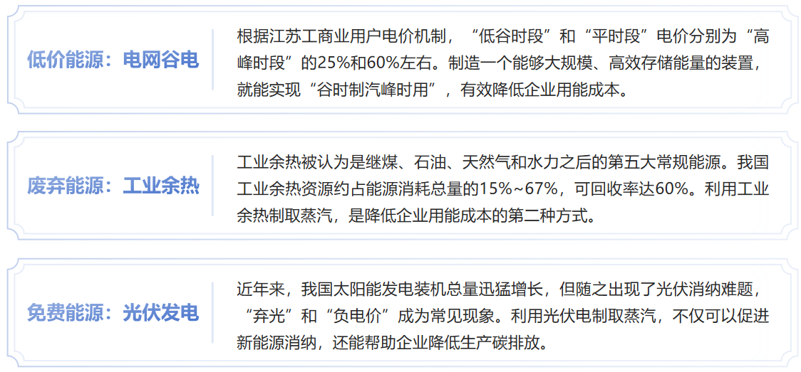 在我国工业领域,70%的企业生产需要用到蒸汽。传统模式下,工业企业获取蒸汽主要依赖热电厂与燃气电厂的集中供应,以及企业自建的燃煤锅炉。然而,随着江苏大力推进“煤炭消费整治”专项行动,环保标准大幅升级,大量企业自建燃煤锅炉因污染物排放不达标而陆续关停。企业面临“足量”用汽难、“低价”用汽难、“低碳”用汽难的问题。