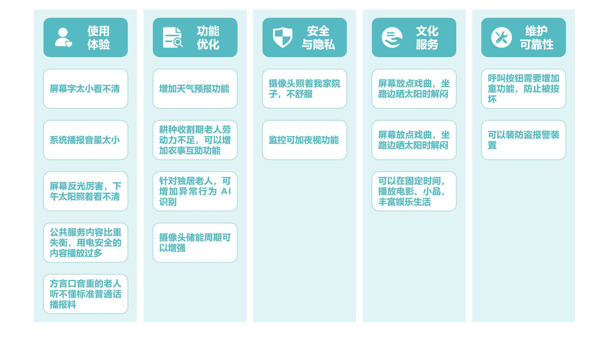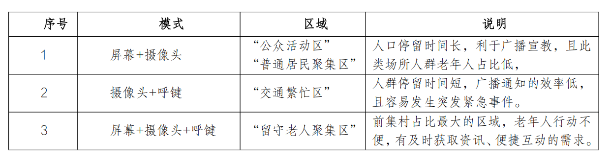 依据人口分布与活动规律,将村庄划分4类区域,差异化配置“屏幕+摄像头”“摄像头+呼键”等模式,精细化服务,实现资源效率最大化。