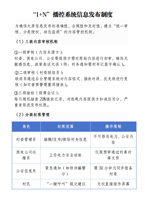 专人负责“播控系统”的操作与维护,及时发布各类信息,包括村务通知、惠民政策宣传等,确保村民及时获取信息。累计发布村务通知42条、电力安全宣传动画28期、惠民政策解读15次,覆盖全村100%留守老人。为确保大屏信息发布的准确性、合规性和及时性,建立“统一审核、动态监测”的内容管控机制。