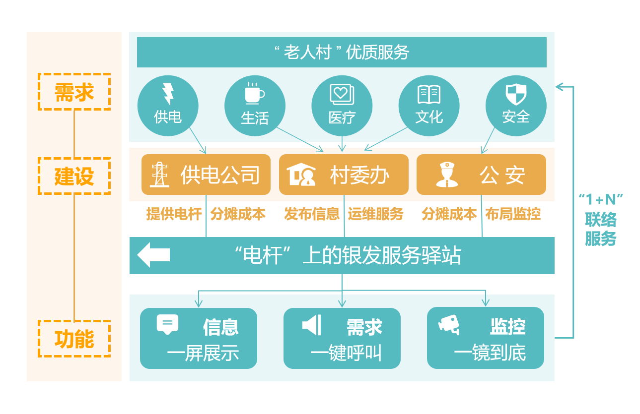 针对“老人村”无法使用智能设备、手脚不便等特殊情况,建设一个“三个一”播控系统,可以播报紧急、重要信息,同时具备互动、监控等功能的融合体。