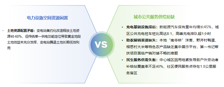 在新型电力系统建设与城市高质量发展背景下,兴化市面临土地资源错配与公共服务短缺系统性挑战。一方面,变电站集约化改造释放出40%-60%黄金地段土地资源,但传统供电设施单一功能定位导致高价值空间长期沉睡;另一方面,中心城区民生需求供需失衡、助农展销渠道缺失、充电基础设施滞后等矛盾集中爆发,暴露出土地资源紧约束与公共服务缺位的结构性矛盾。这种电力设施空间资源闲置与城市公共服务供给短缺并存现象,反映了传统基础设施功能隔离发展模式与城市集约高效发展要求的深层次矛盾,亟需通过空间功能重构实现资源整合与价值再造。