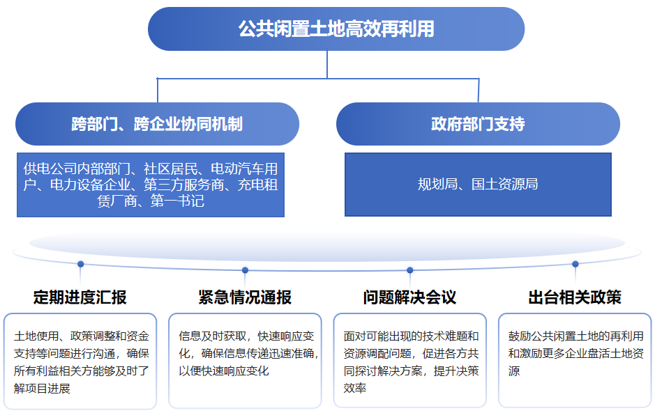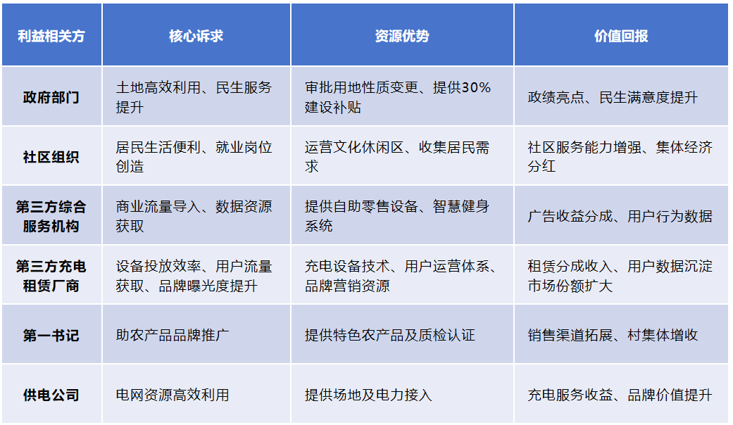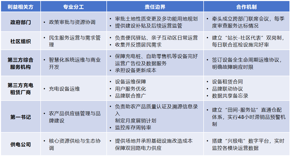 公司引入利益相关方共同治理理念,打破供电公司传统单点主导充电桩选址建桩模式。通过走访政府、社区、第三方机构、第一书记等,了解各方合作意愿、核心诉求、优势资源,构建“政府规划引导+社区需求反馈+企业资源供给+第三方技术支撑”参与协同机制。通过联合政府规划部门、社区居委会等利益相关方开展联席论证,精准识别出闲置土地再利用需同时满足“充电设施缺口填补”“社区15分钟生活圈补强”“助农渠道搭建”“户外劳动者服务”等社会需求,在变电站改造初期即嵌入综合服务功能规划,提升土地复用方案与城市规划、民生需求匹配度。
