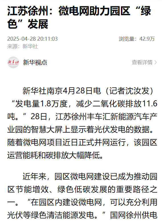 社会价值,微电网“加盟”模式,通过共建、共担、共享,实现了降低投资成本,减少投资风险,共享多元价值,有效破解传统“自营”模式下微电网推广难题,更加有利于在全国中小园区复制应用。目前该模式已经在徐州高新区生物医药产业园实现复制应用,将逐步在铜山青龙山、张集矿、马庄矿、马坡矿等园区微网项目中进行推广,为全国7万余个产业园区实现用能方式转变提供有益借鉴参考,项目得到了新华社、国网江苏电力微信公众号等内外部媒体的广泛报道,阅读浏览量超60万次,擦亮了微电网“加盟”绿电合伙人模式品牌。