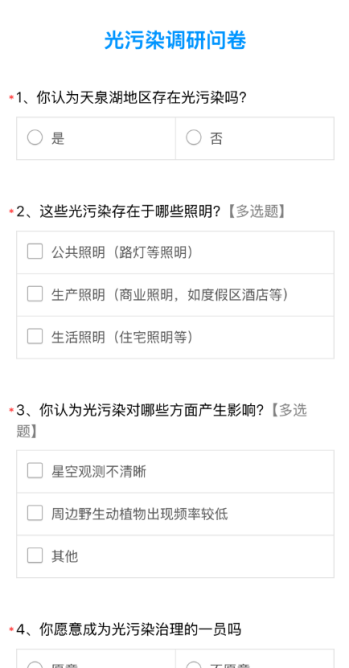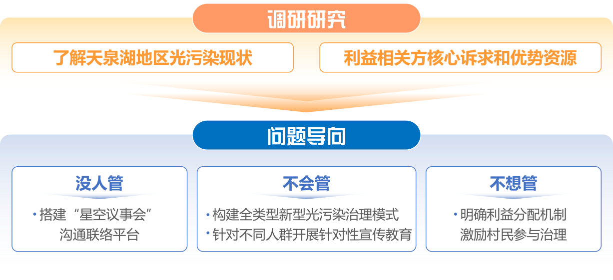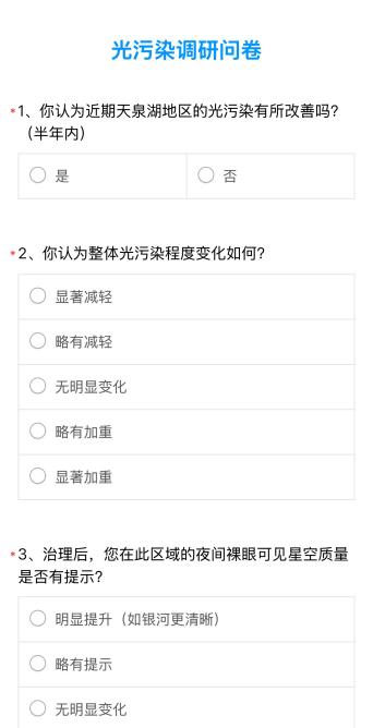 寻找“星空议事员”,“闭环式”检验光污染治理成效。通过“星空议事会”平台寻找“星空议事员”,并在该群体间开展问卷调研,并通过定期问卷调研来观测光污染治理情况,实现项目成效评估的闭环。