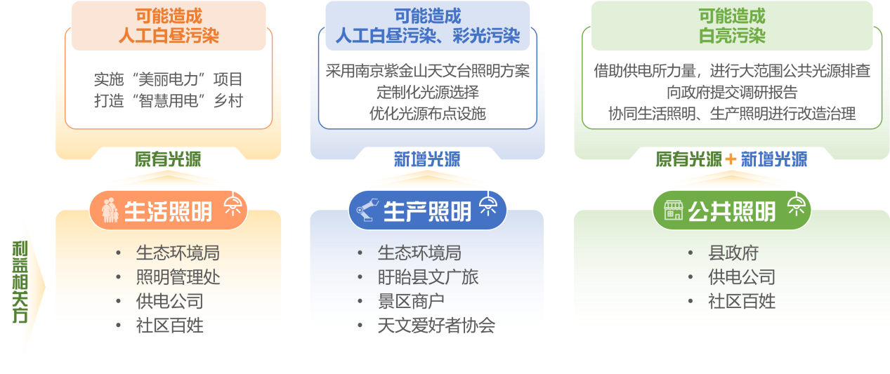 为了解决光污染治理“不会管”的问题,根据在“星空议事会”上沟通商定的责任分工,供电公司在照明管理处、天文爱好者协会等的指导下,探索光源全分类,根据生活照明、生产照明和公共照明三大分类,分别对两类光源(新增光源、原有光源)制定针对性管理措施,扩大光污染治理范围。