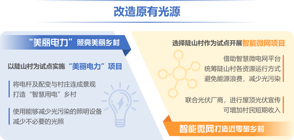 在原有光源方面,光污染主要来源于周边乡村的原有光源,此类光源改造难度大、成本高。在县政府的统一领导下,供电公司在陡山村、雨山村推进“美丽电力”项目,打造“智慧用电乡村”。